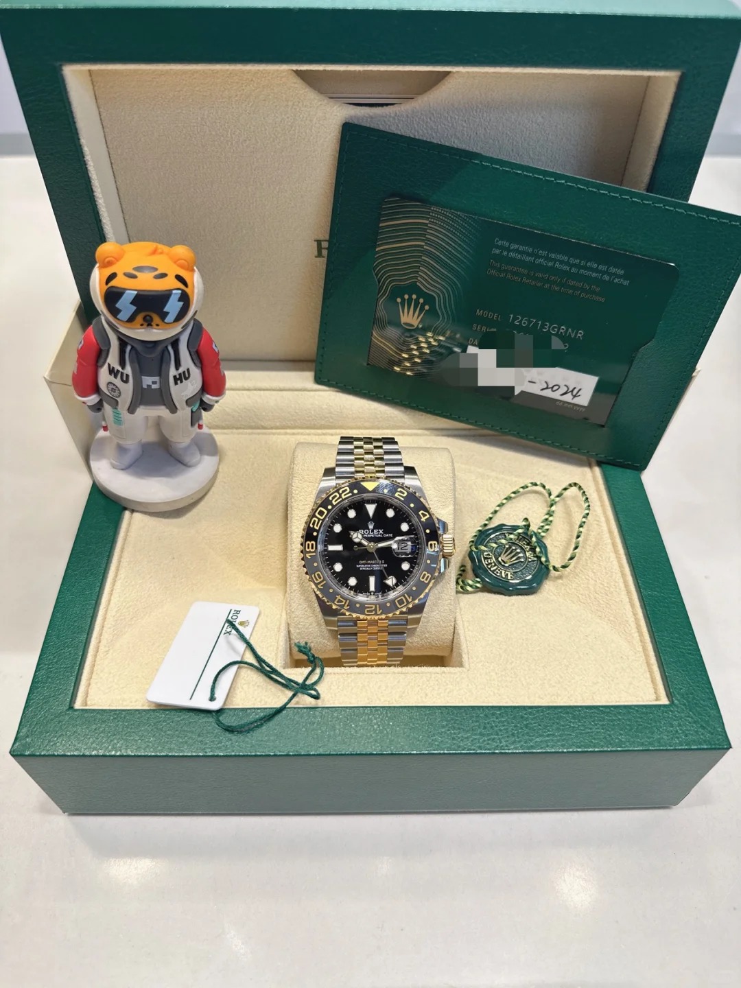 The watch is unworn and comes complete with full set of original accessories. such as watch box. warranty card dated recently. booklets and manuals.