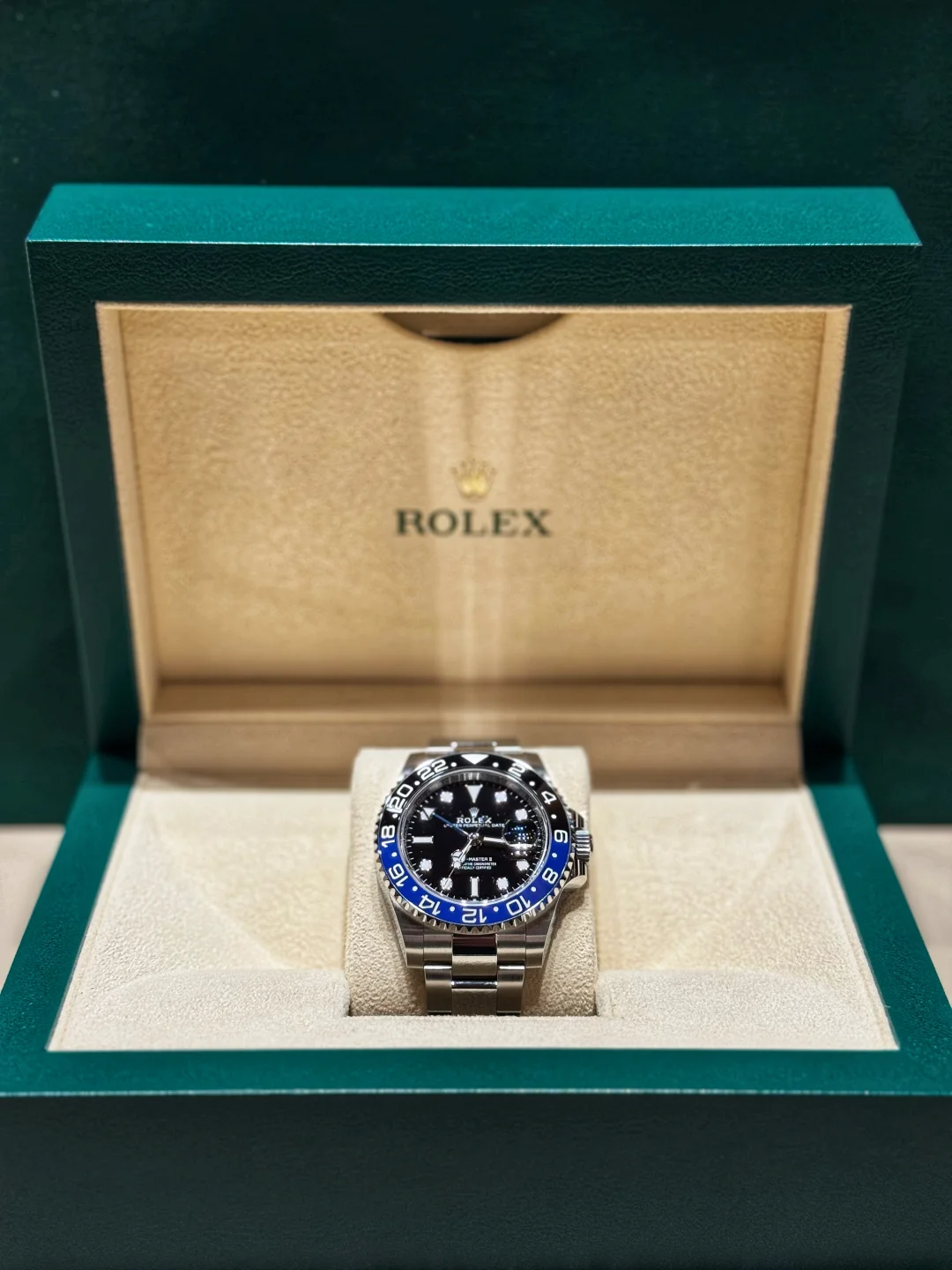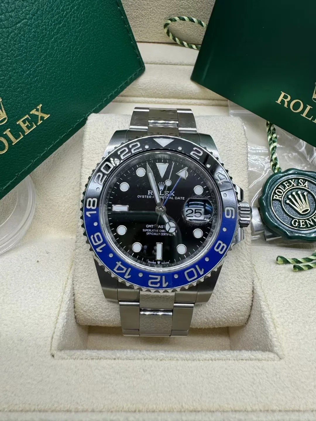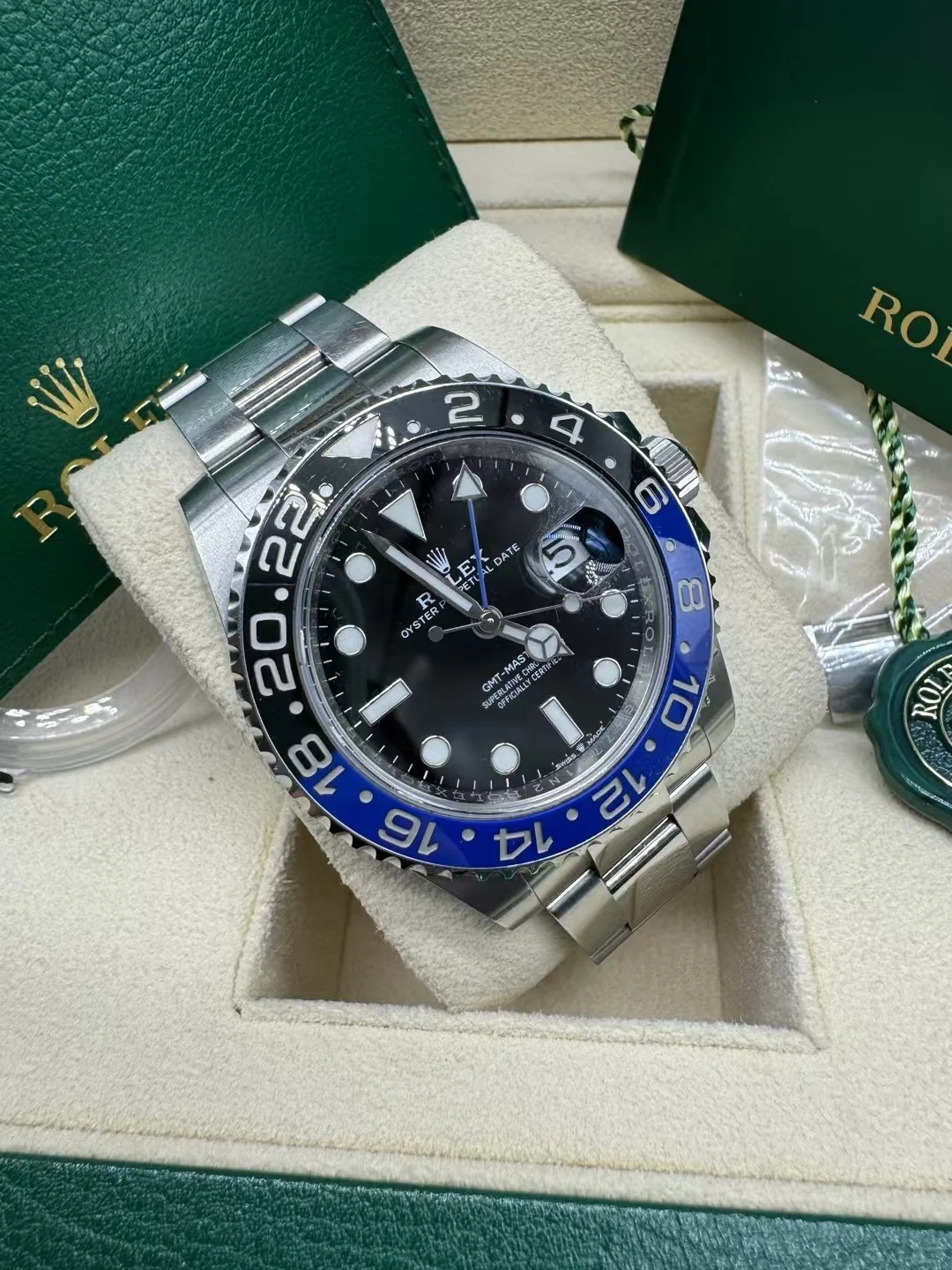 The watch is unworn and comes complete with full set of original accessories. such as watch box. warranty card dated recently. booklets and manuals.