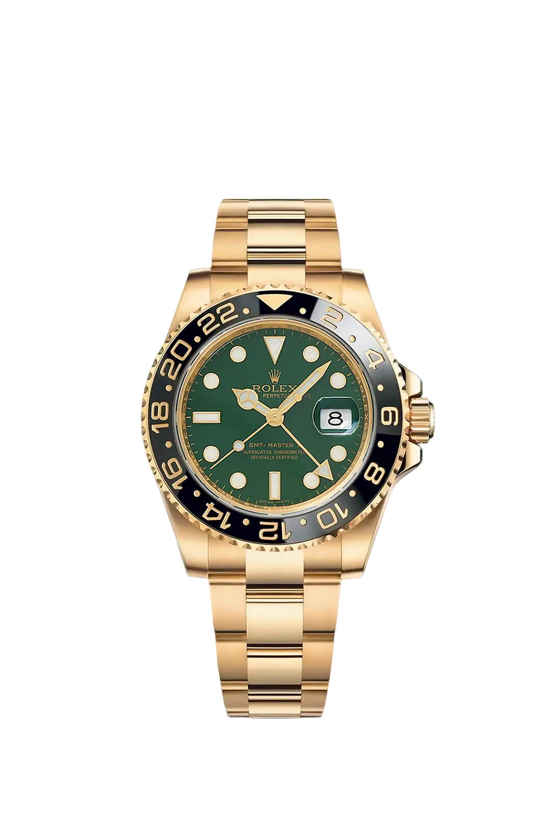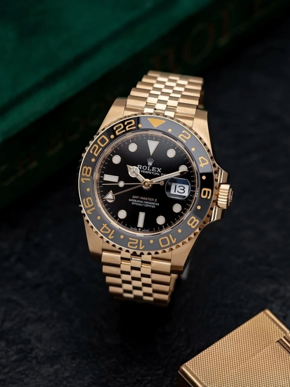 The Oyster Perpetual GMT-Master II is available in yellow gold and Oystersteel with a black dial and a Jubilee bracelet. -m126713grnr-0001 40mm