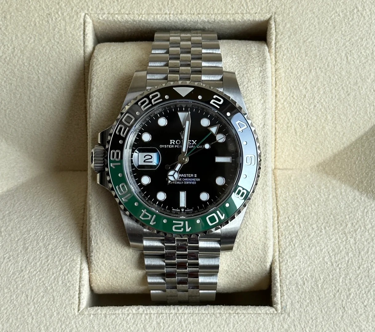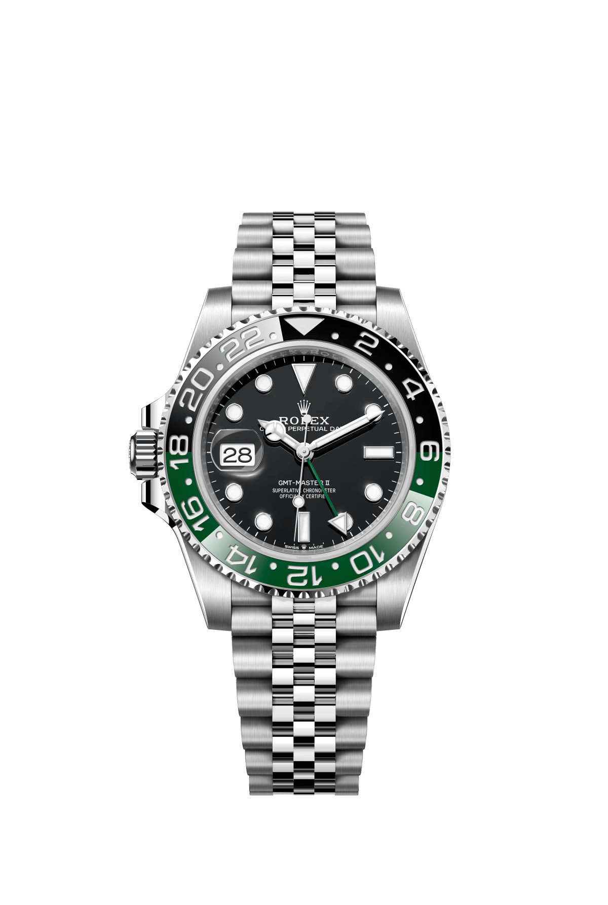 The Oyster Perpetual GMT-Master II is available in Oyster steel with a black dial and a Jubilee bracelet. -m126710grnr-0003 40mm