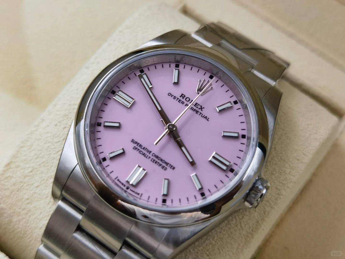 The Oyster Perpetual 36 is presented with a candy pink dial and an Oyster bracelet. -m126000-0008