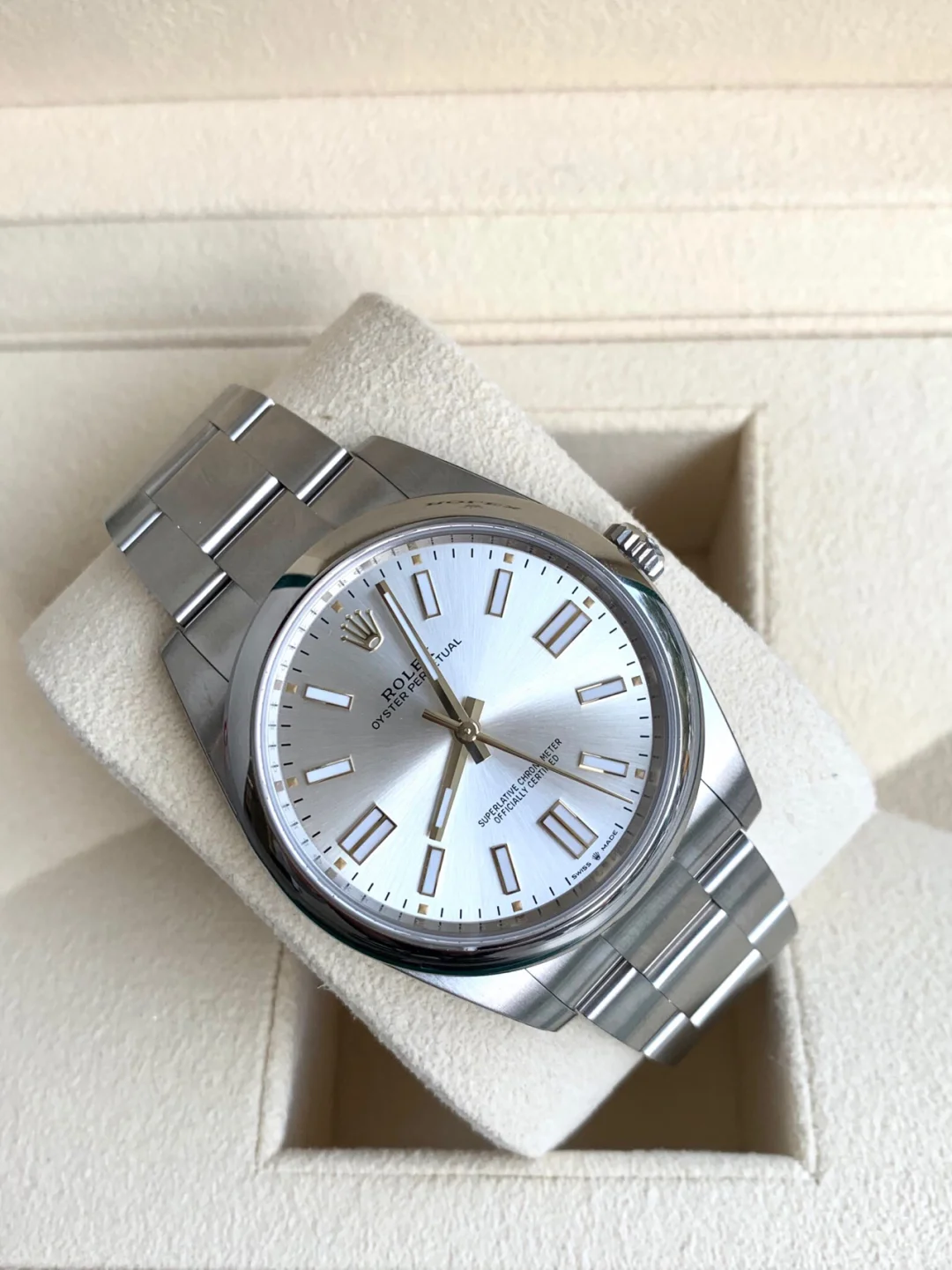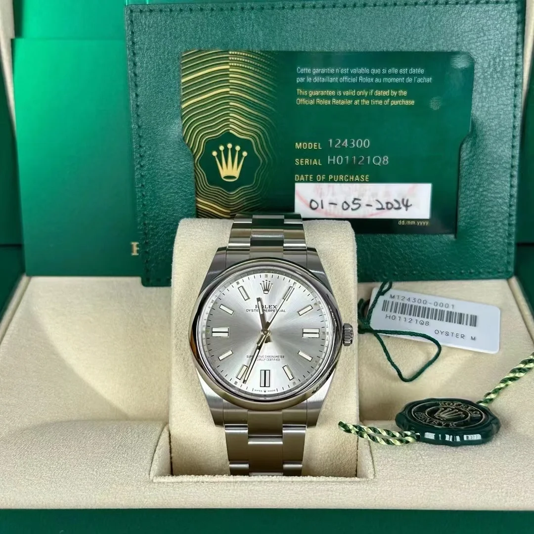The Oyster Perpetual 41 is fitted with a silver dial and an Oyster bracelet. -m124300-0001