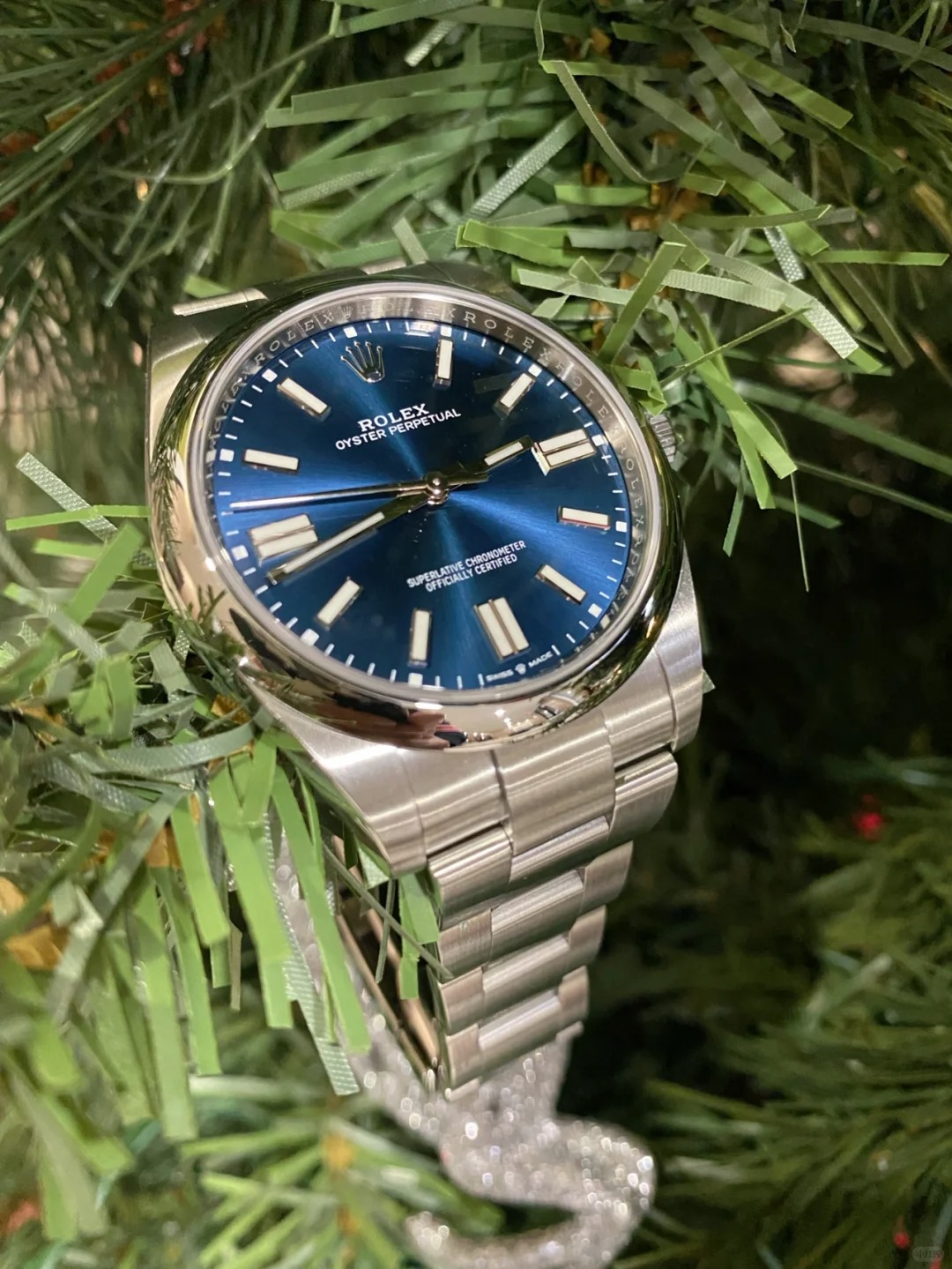 The Oyster Perpetual 41 is presented with a bright blue dial and an Oyster bracelet. -m124300-0003