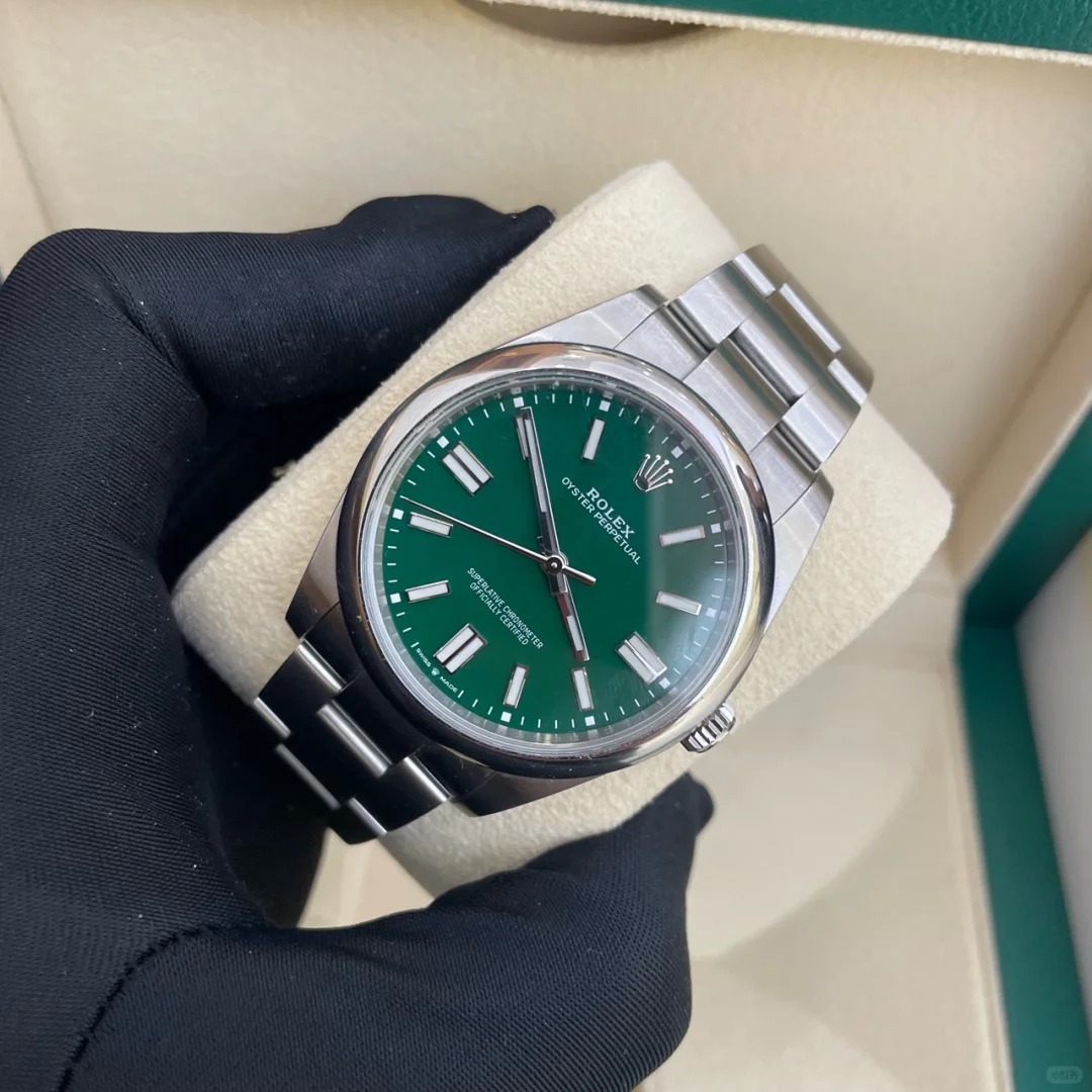 The Oyster Perpetual 41 is presented with a green dial and an Oyster bracelet. -m124300-0005
