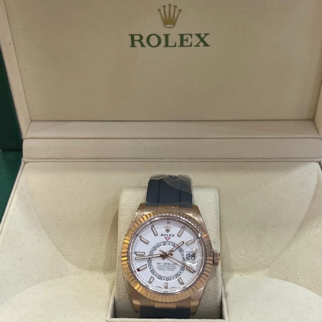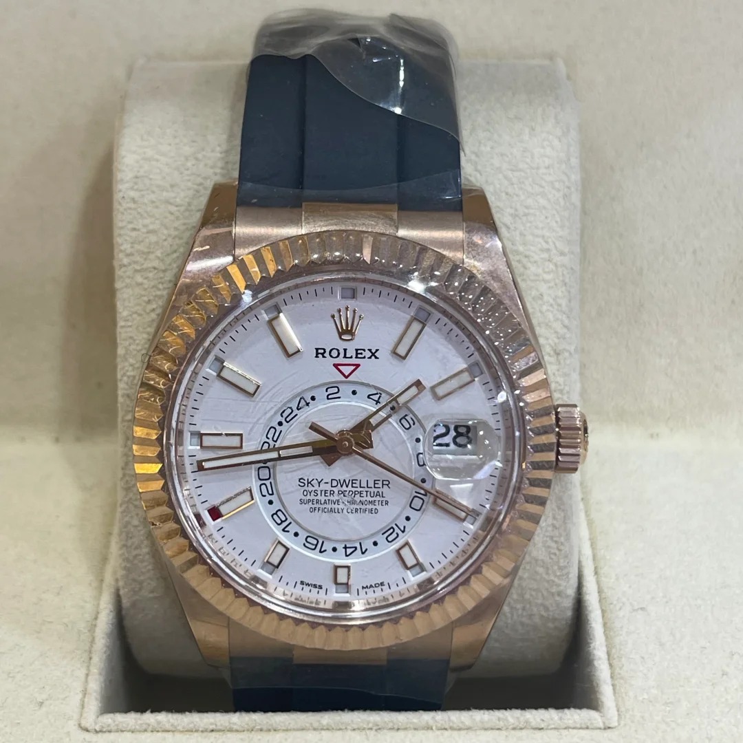 • The Oyster Perpetual Sky-Dweller in 18 ct Everose gold with a mellow white dial and an Oysterflex bracelet. -m336235-0003 42mm