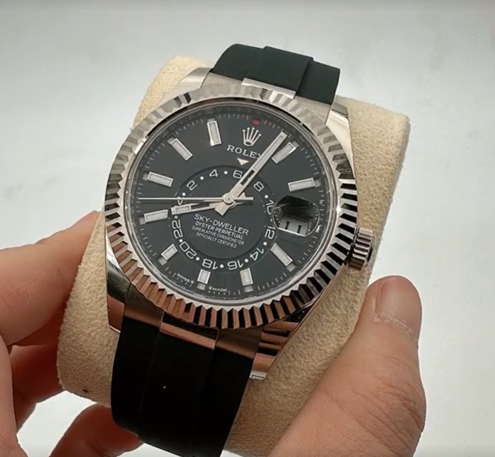 The Oyster Perpetual Sky-Dweller is available in 18 ct white gold with a glossy black dial and an Oysterflex strap. -m336239-0002 42mm