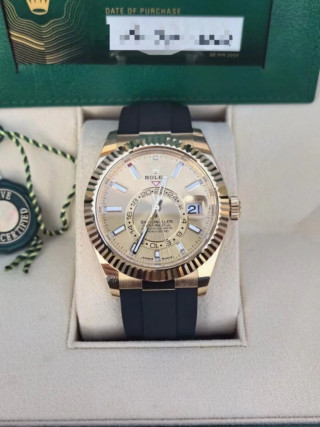 The Oyster Perpetual Sky-Dweller is available in 18 ct yellow gold with a champagne-coloured dial and an Oysterflex strap. -m336238-0001 42mm