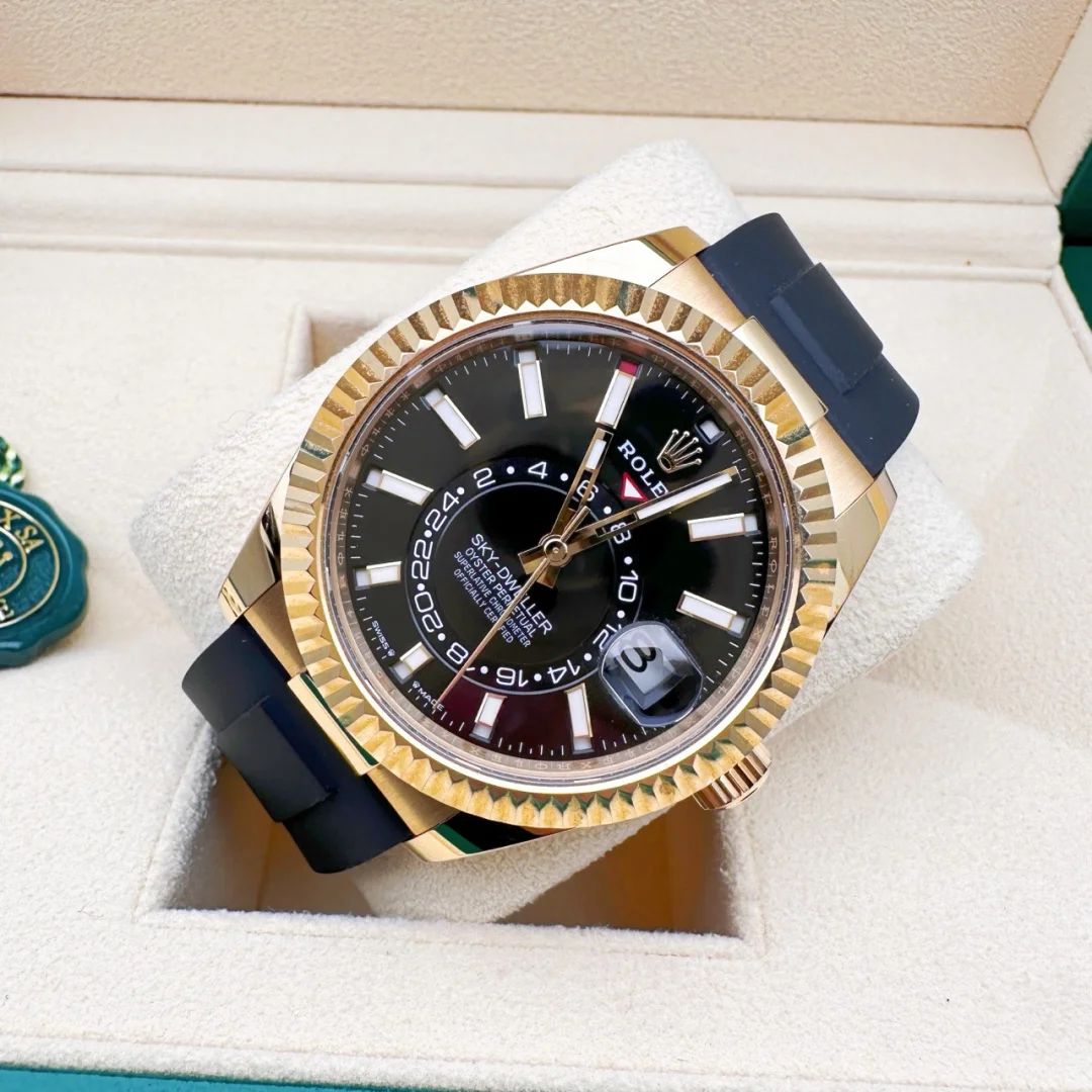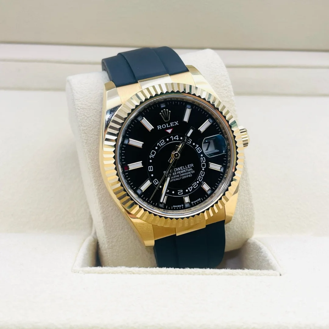• The Oyster Perpetual Sky-Dweller is available in 18 ct yellow gold with a glossy black dial and an Oysterflex bracelet. -m336238-0002 42mm