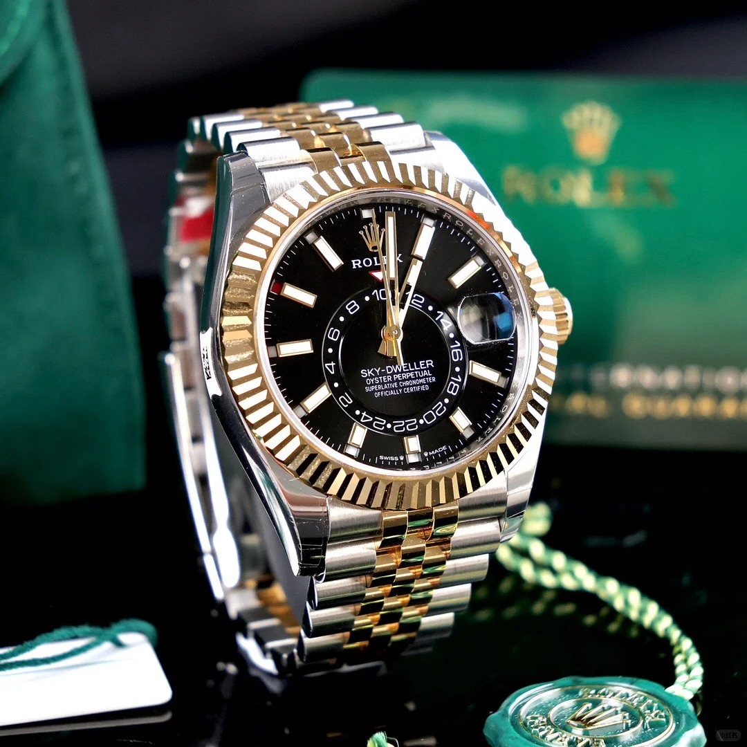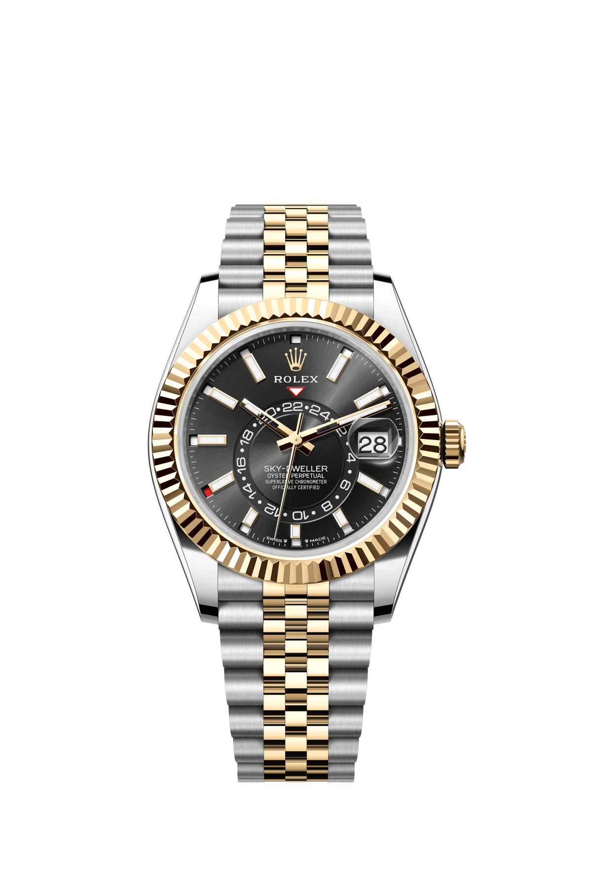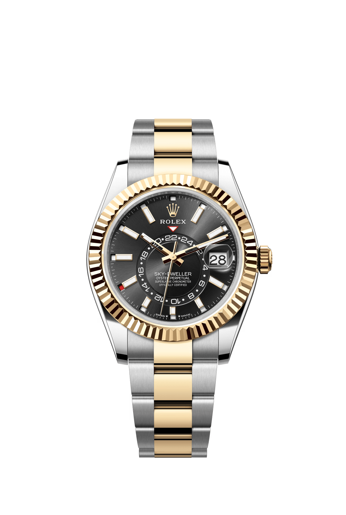 The Oyster Perpetual Sky-Dweller is available in yellow gold and Oysteel. with a glossy black dial and an Oyster bracelet. -m336933-0003 42mm