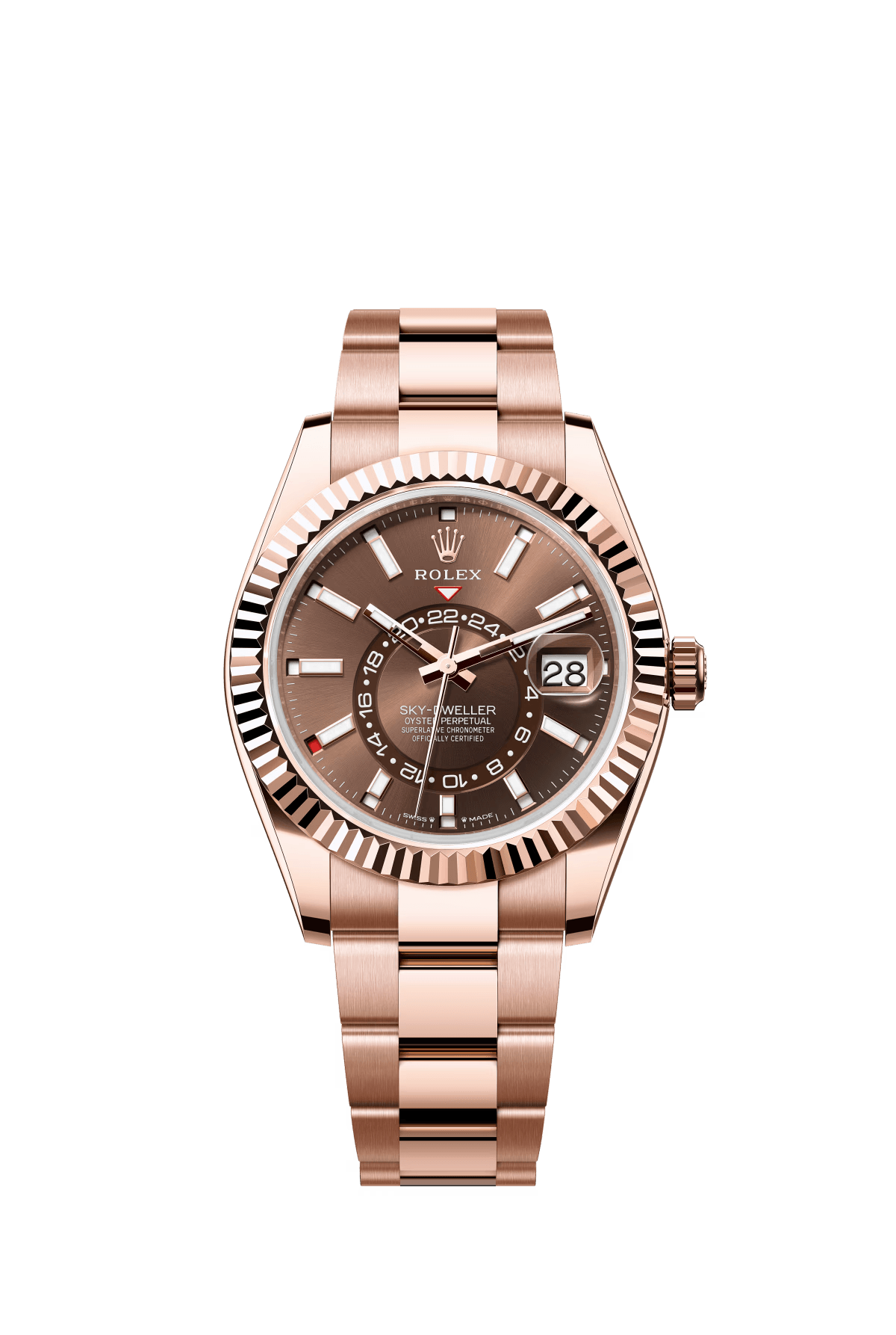 The Oyster Perpetual Sky-Dweller in 18-carat Everose gold with a chocolate-coloured dial and an Oyster bracelet. -m336935-0002 42mm