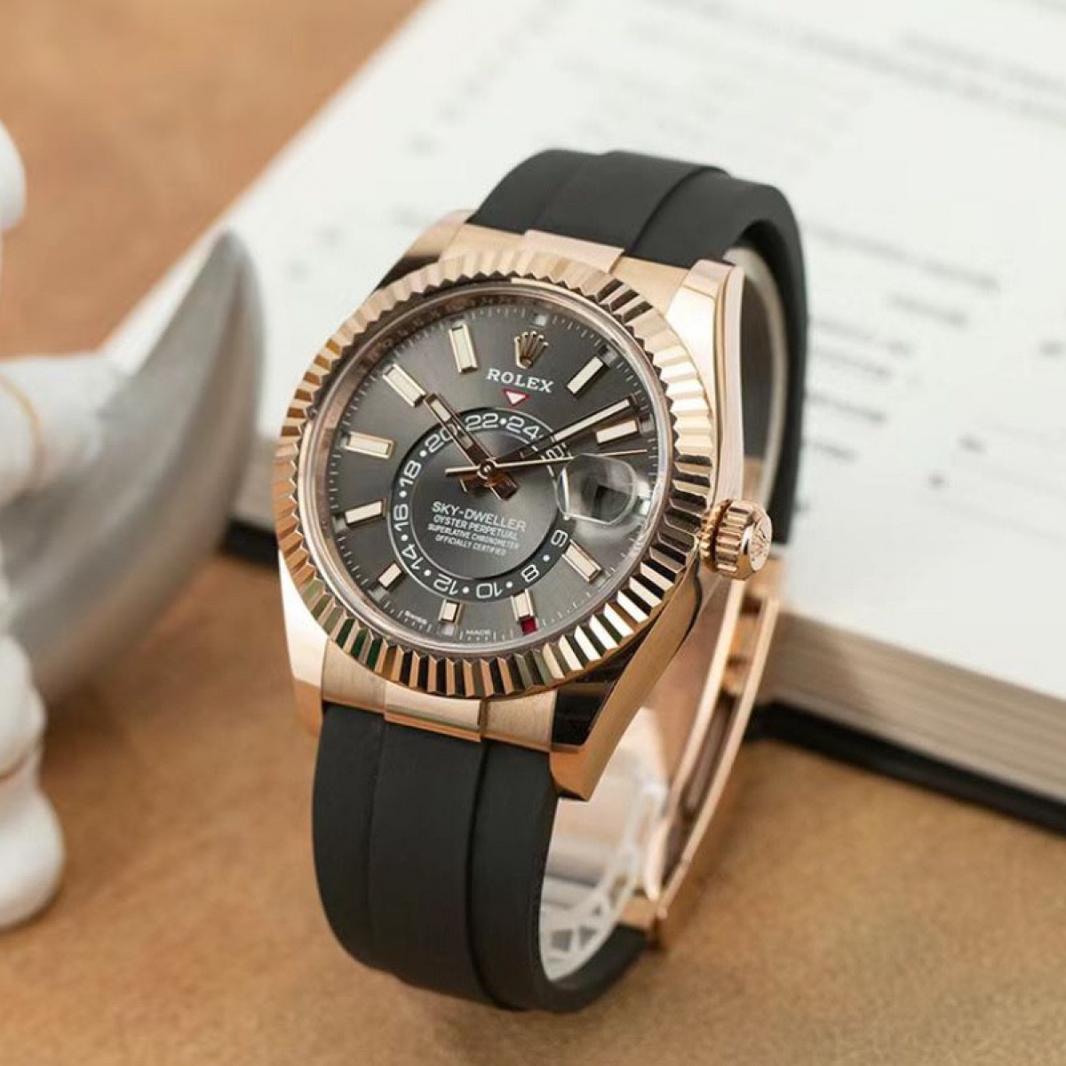 The Oyster Perpetual Sky-Dweller in 18-carat Everose gold with a slate grey dial and an Oysterflex strap. -m336235-0004 42mm