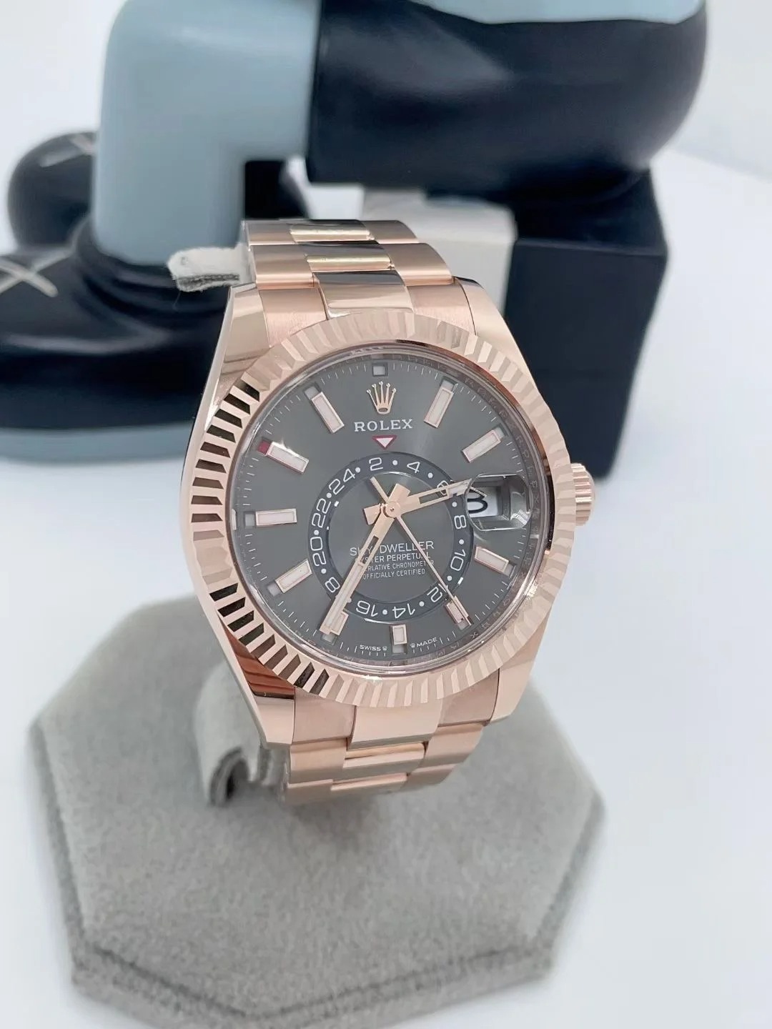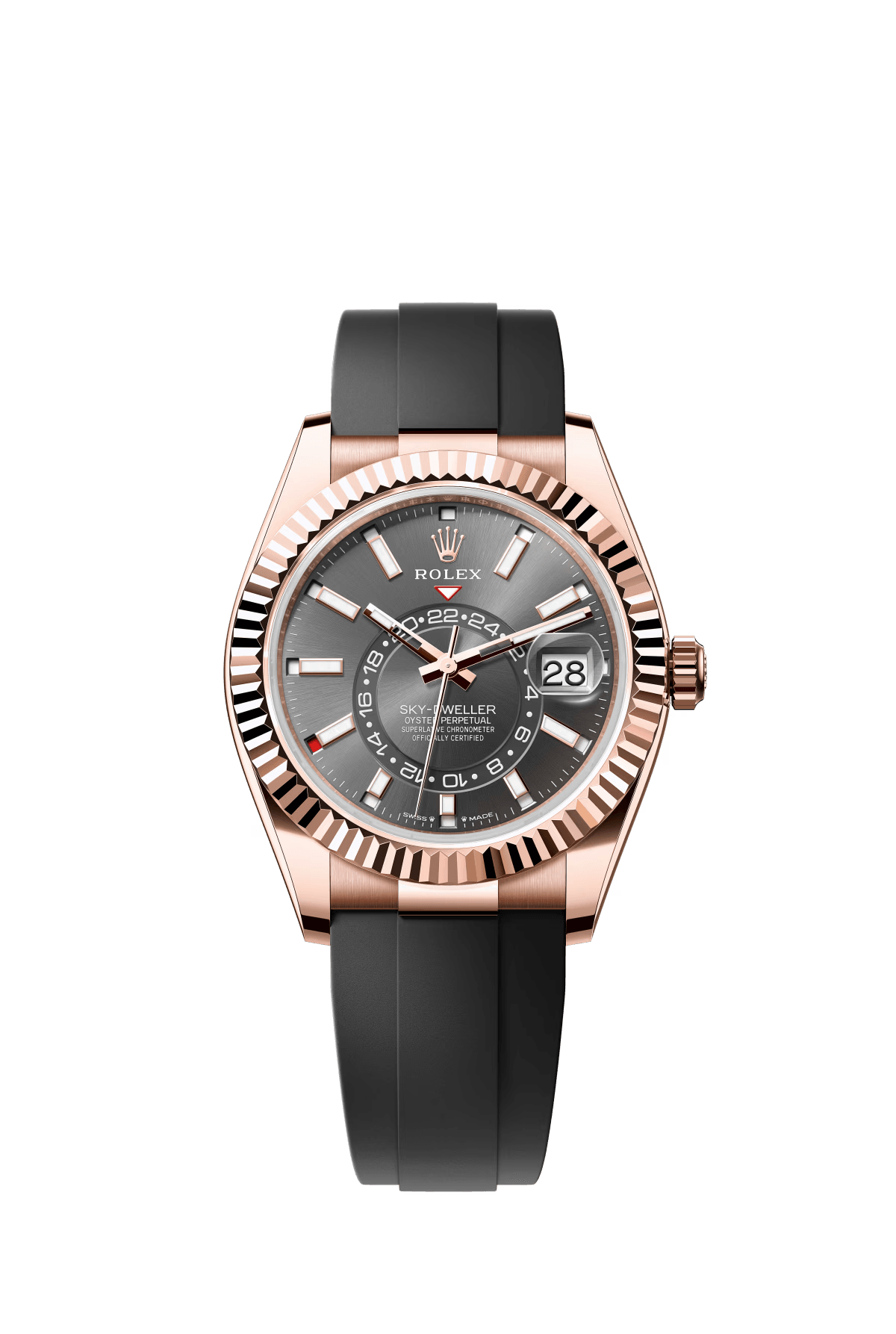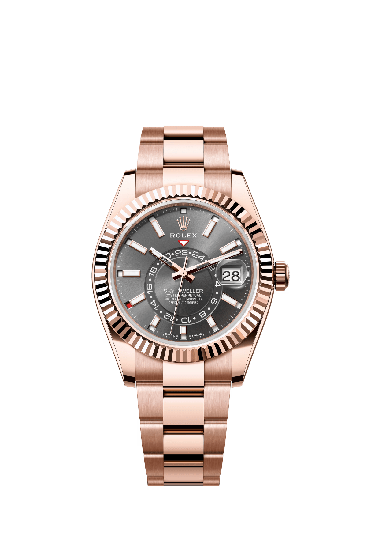 The Oyster Perpetual Sky-Dweller in 18 ct Everose gold with a slate grey dial and an Oyster bracelet. -m336935-0004 42mm