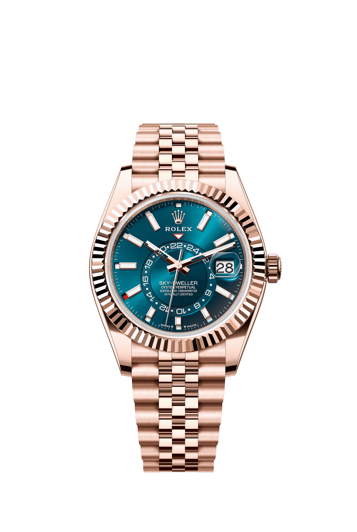 The Oyster Perpetual Sky-Dweller in 18 ct Everose gold with a turquoise dial and a Jubilee bracelet. -m336935-0005 42mm