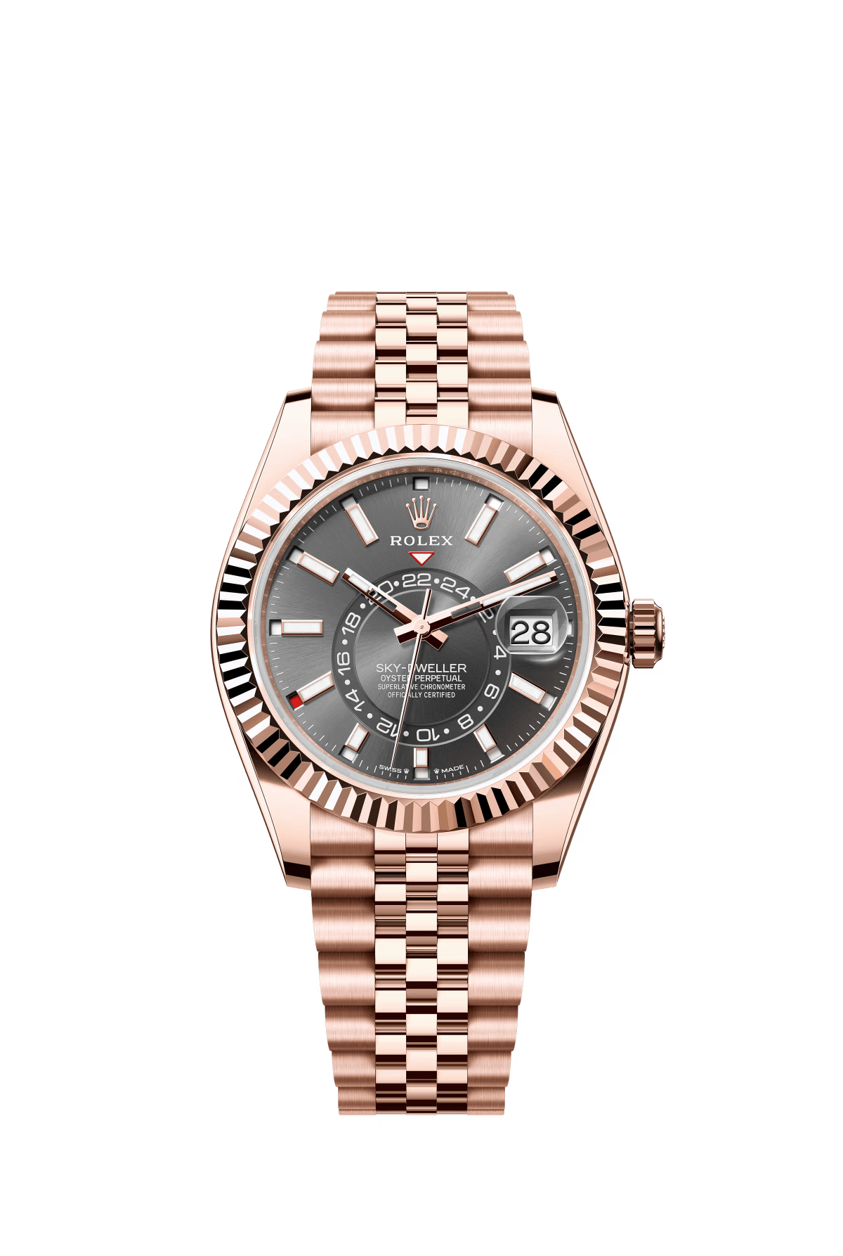 The Oyster Perpetual Sky-Dweller in 18 ct Everose gold with a slate grey dial and a Jubilee bracelet. -m336935-0008 42mm