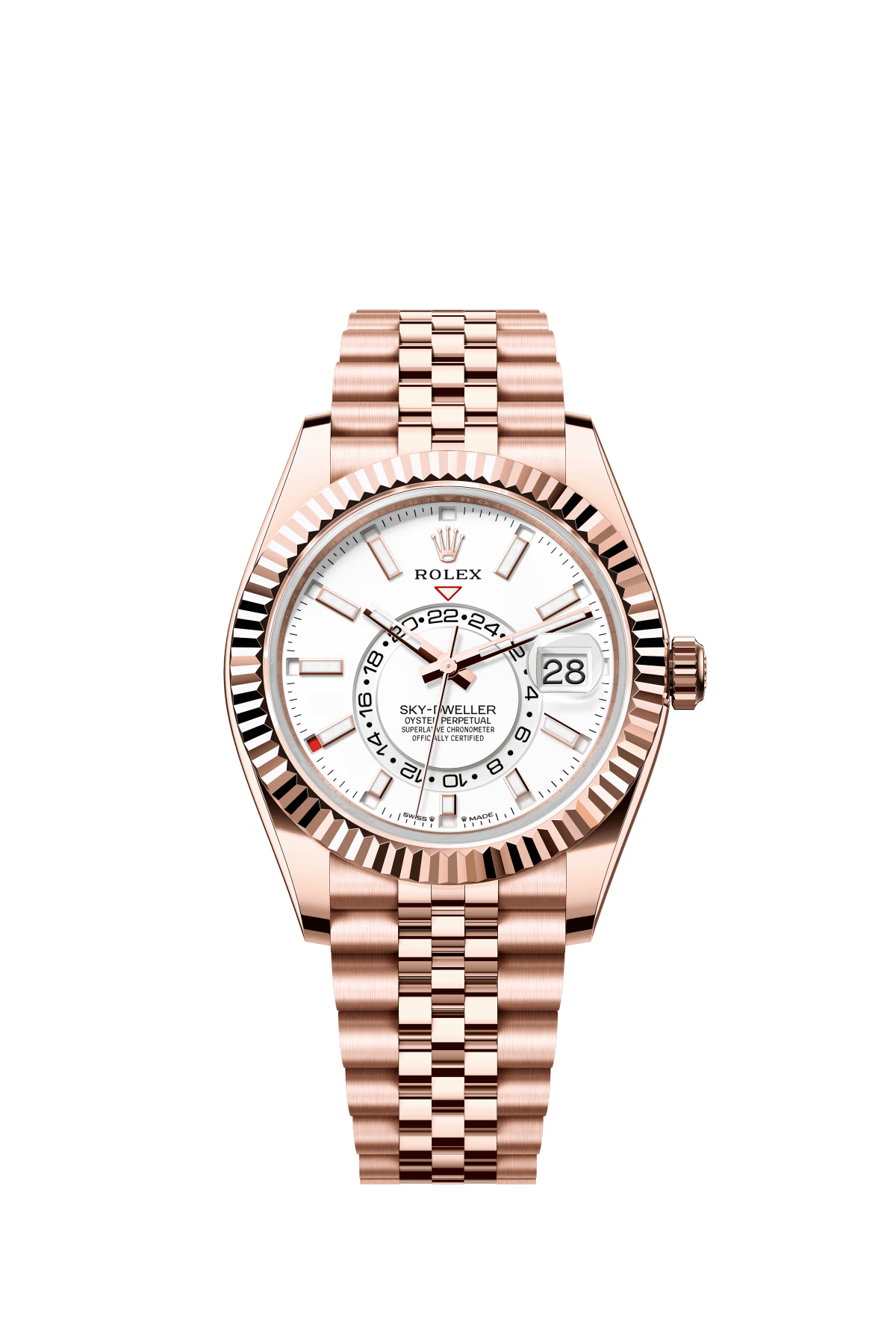The Oyster Perpetual Sky-Dweller in 18-carat Everose gold with a mellow white dial and a Jubilee bracelet. -m336935-0007 42mm