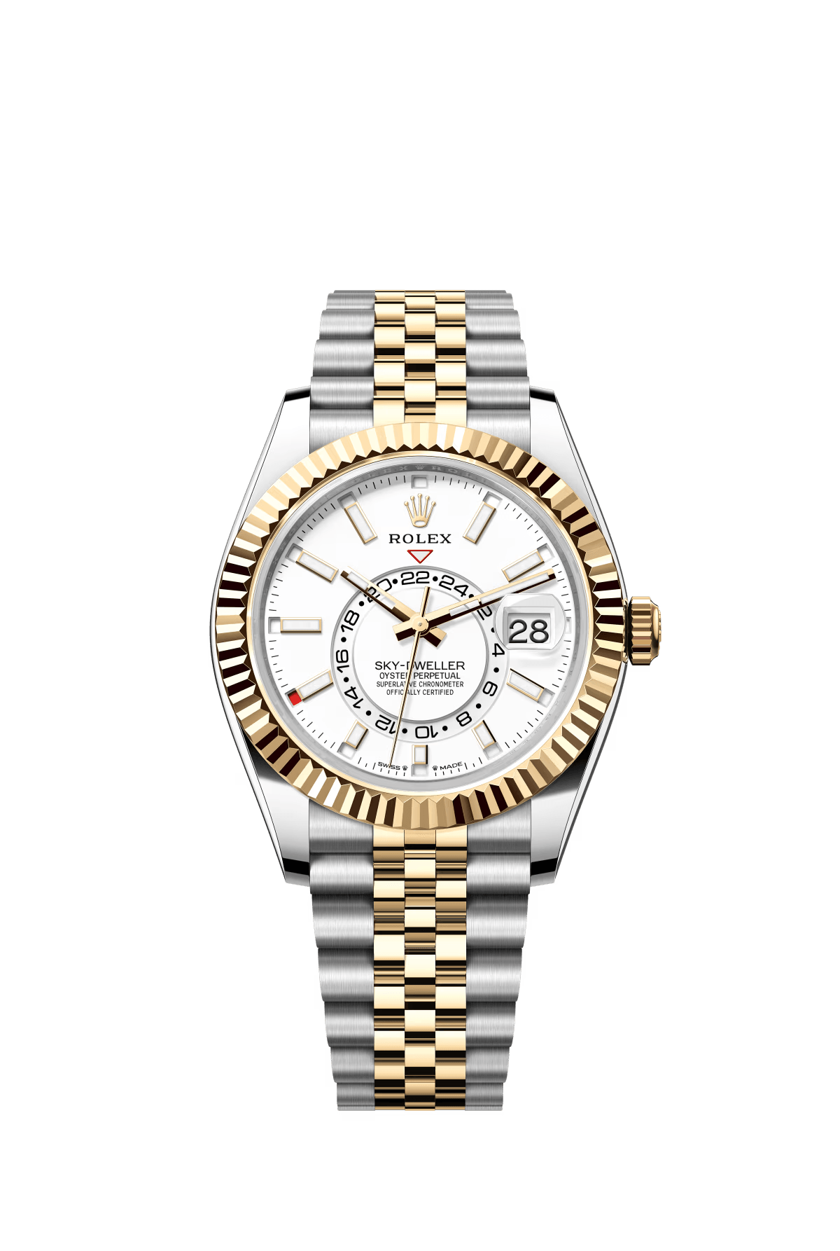 The Oyster Perpetual Sky-Dweller is available in yellow gold and Oystersteel with a mellow white dial and a Jubilee bracelet. -m336933-0006 42mm