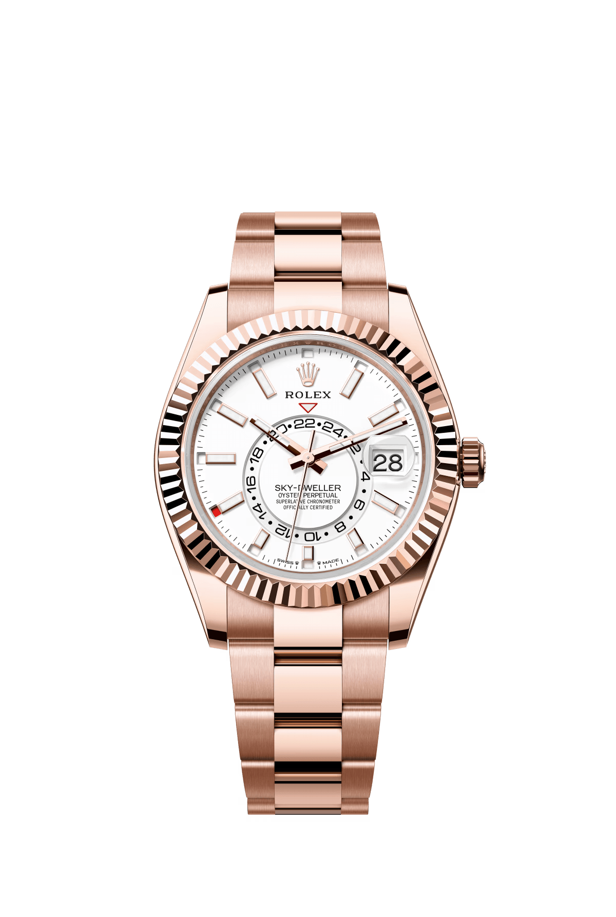 The Oyster Perpetual Sky-Dweller in 18-carat Everose gold with a mellow white dial and Oyster bracelet. -m336935-0003 42mm