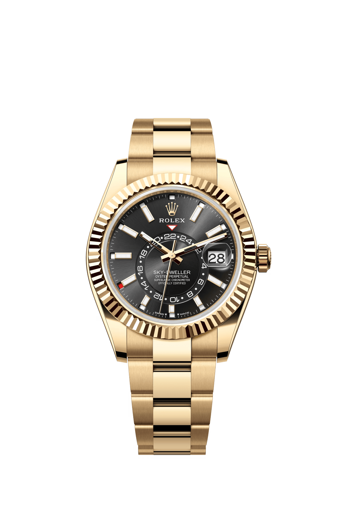 The Oyster Perpetual Sky-Dweller is available in 18 ct yellow gold with a glossy black dial and an Oyster bracelet. -m336938-0002 42mm