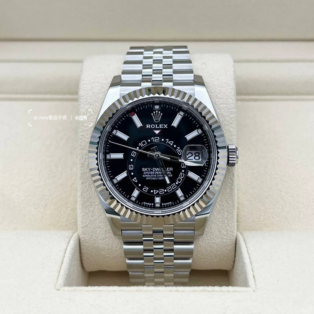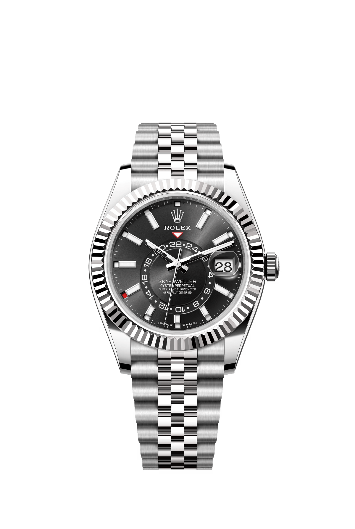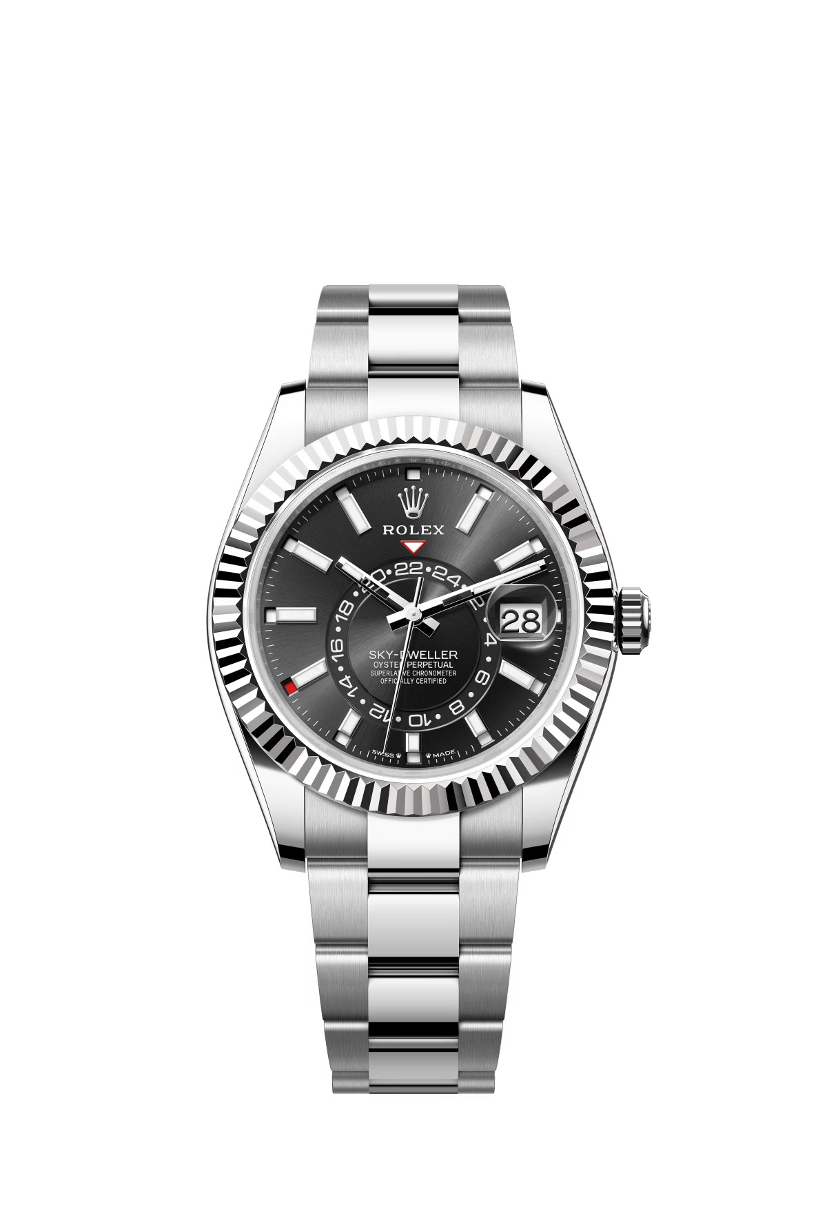 The Oyster Perpetual Sky-Dweller is available in white gold and Oysteel. with a glossy black dial and an Oyster bracelet. -m336934-0007 42mm
