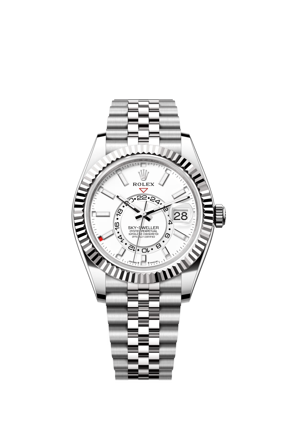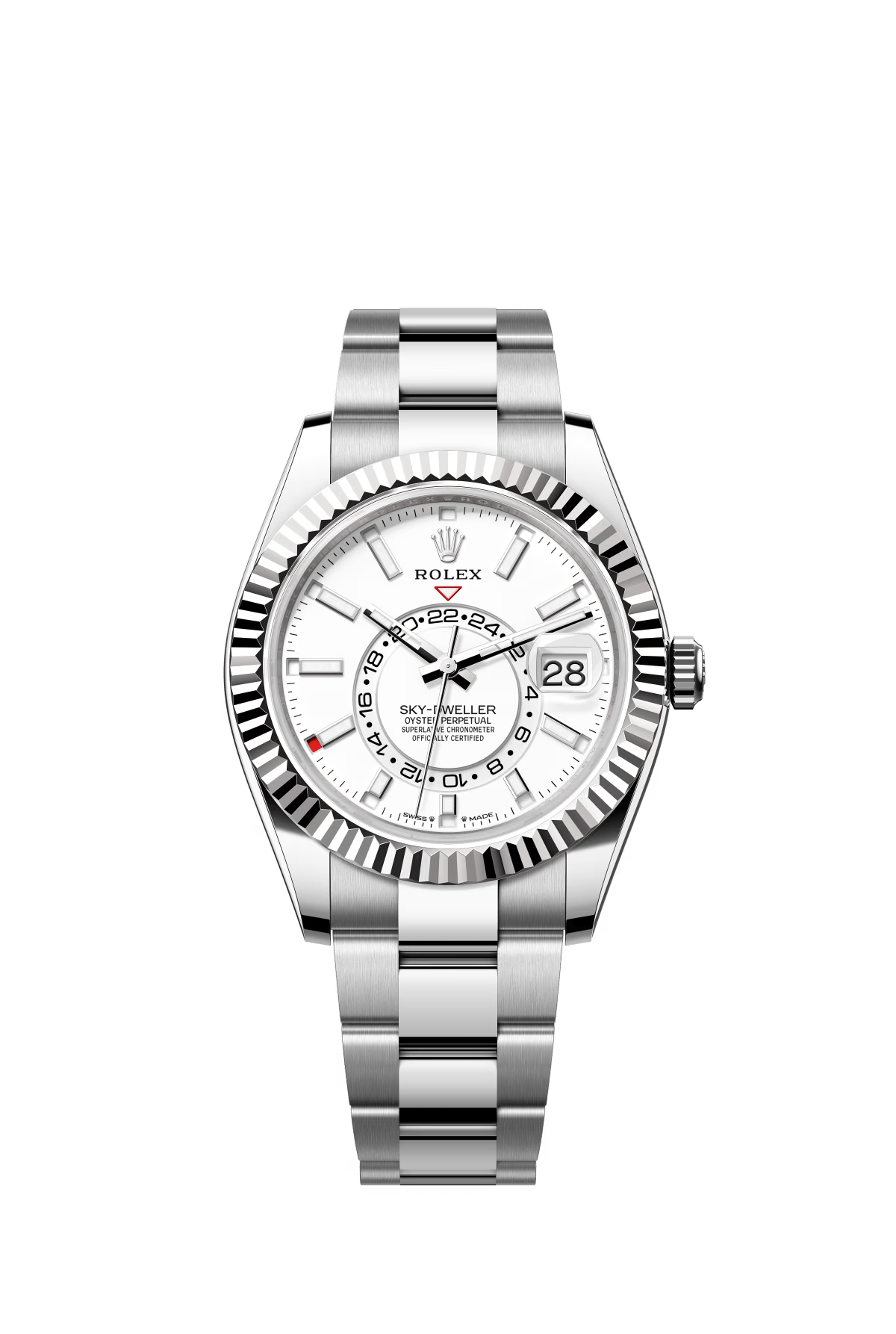 The Oyster Perpetual Sky-Dweller is available in white gold and Oyster steel with a mellow white dial and Oyster bracelet. -m336934-0003 42mm