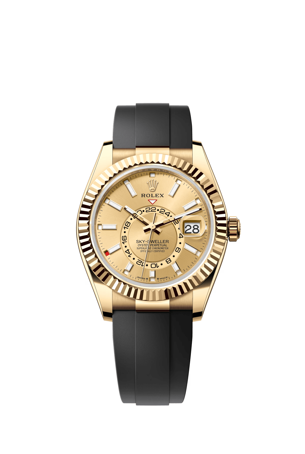 The Oyster Perpetual Sky-Dweller is available in 18 ct yellow gold with a champagne-coloured dial and an Oysterflex strap. -m336238-0001 42mm