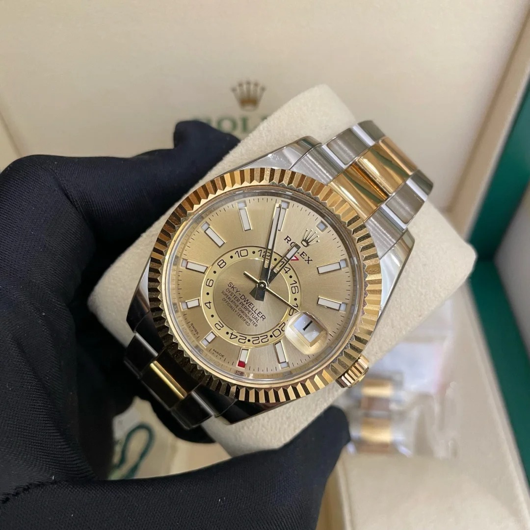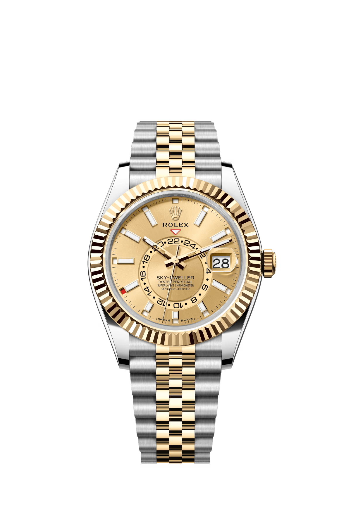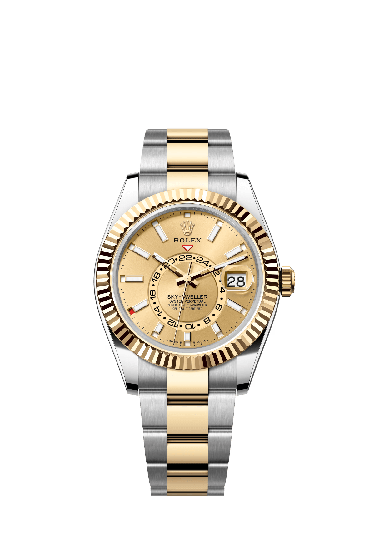 The Oyster Perpetual Sky-Dweller is available in yellow gold and Oystersteel with a champagne-coloured dial and an Oyster bracelet. -m336933-0001 42mm