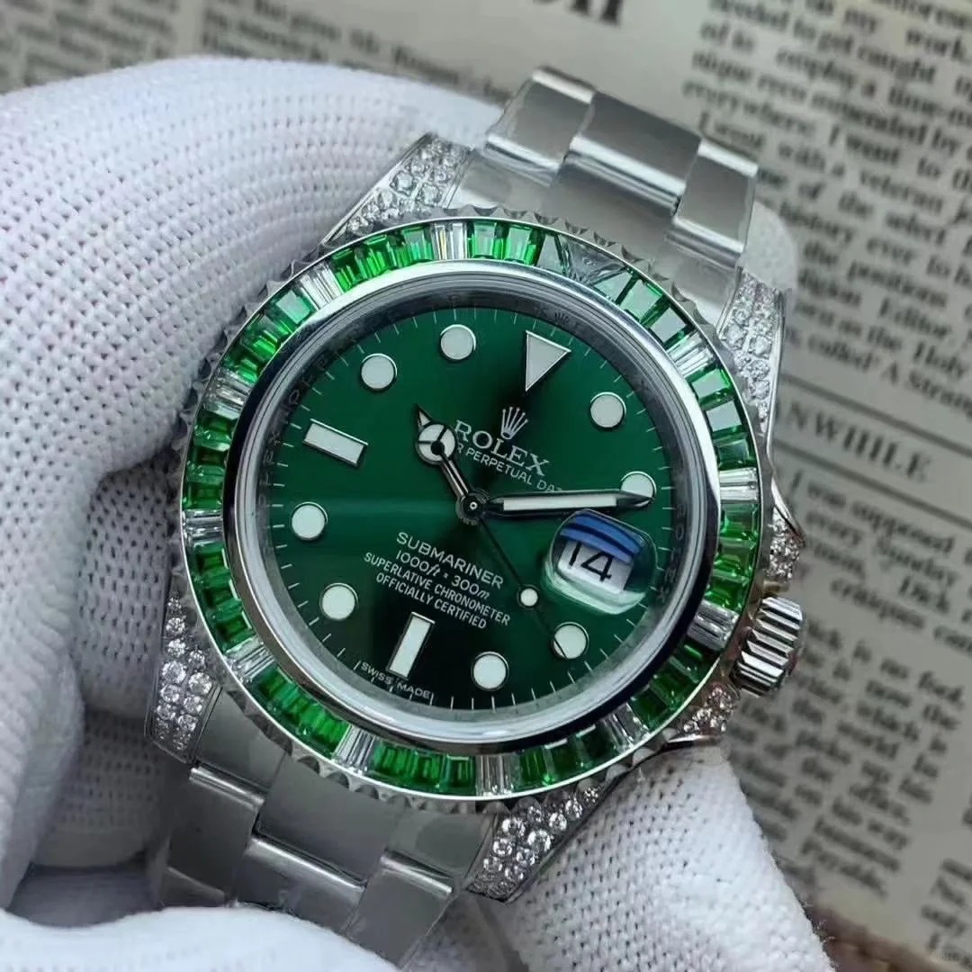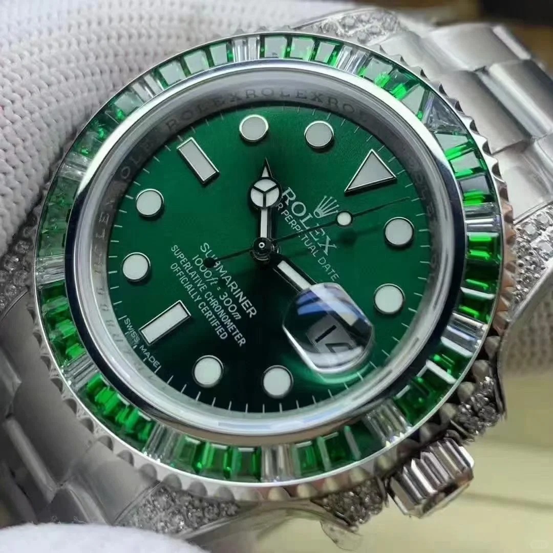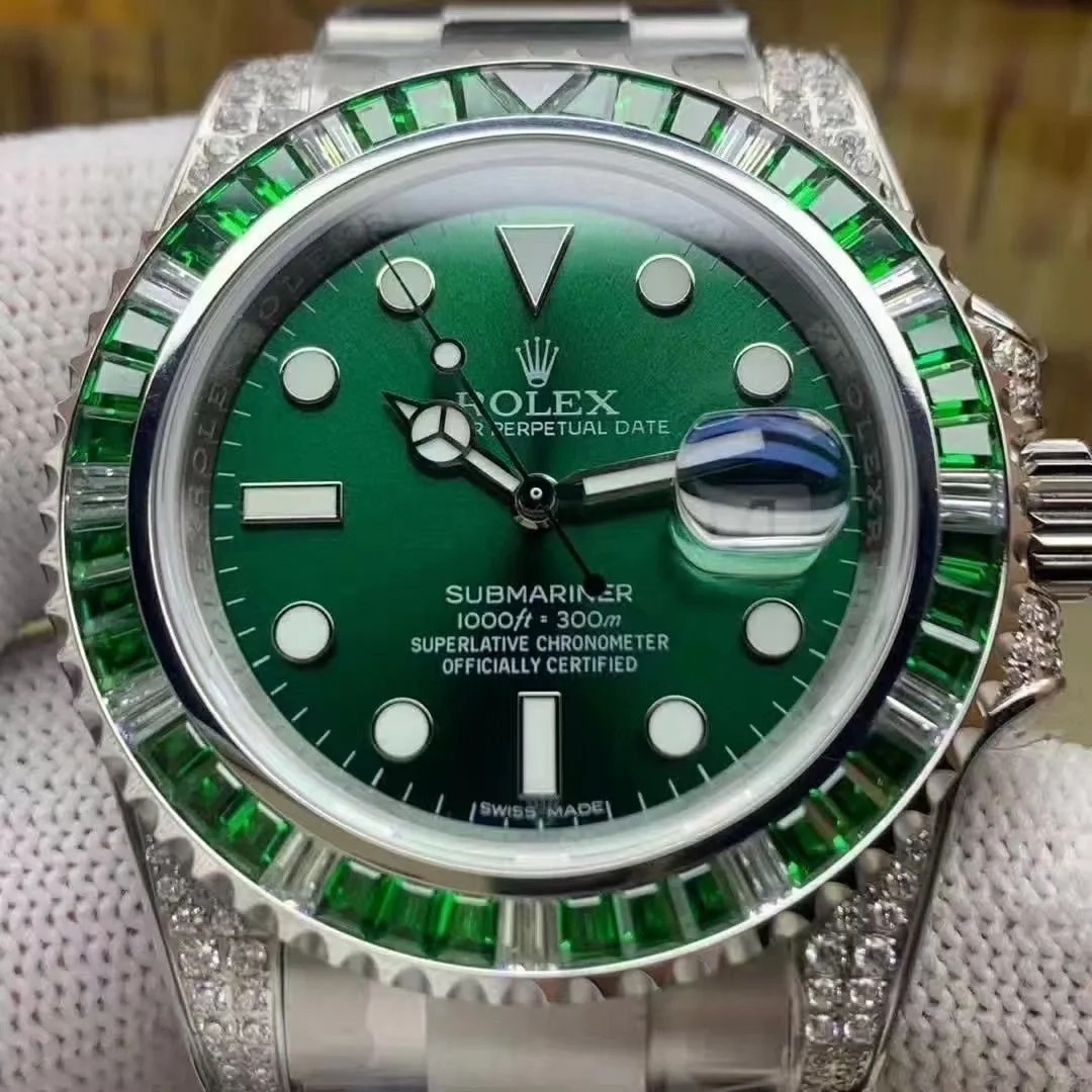 This is an 18K white gold Rolex Submariner 116659SABR. t includes an integral Rolex 18K white gold Oysterlock bracelet with a folding deployment clasp and a scratch resistant emerald crystal. It has a screwed down solid case back and Triplock winding crown protected by diamond set crown guards. The solid three-body 40 mm. diameter case. straight diamond set lugs. bracelet and flat knurled bezel. are polished and brushed. The graduated unidirectional revolving bezel is white gold and set with 27 b aguette cut emerald. and 11 baguette cut diamonds every 10 minutes. the dive triangle at the 60-minute position is set with a triangular diamond. It has a sunburst green dial with luminous white gold-set dot. baton. and arrow hour index markers. luminous white gold Mercedes style Rolex minute and hour hands. a center sweep second hand with a luminous lollipop indicator. a white minute/second perimeter chapter ring. and a cyclops magnification lens for the date aperture window at 3 o'clock. It's water resistant to 330 meter/1.000 feet. it has a 48-hour power reserve at full winding. and the 13mm thick case. dial. and movement are all signed.