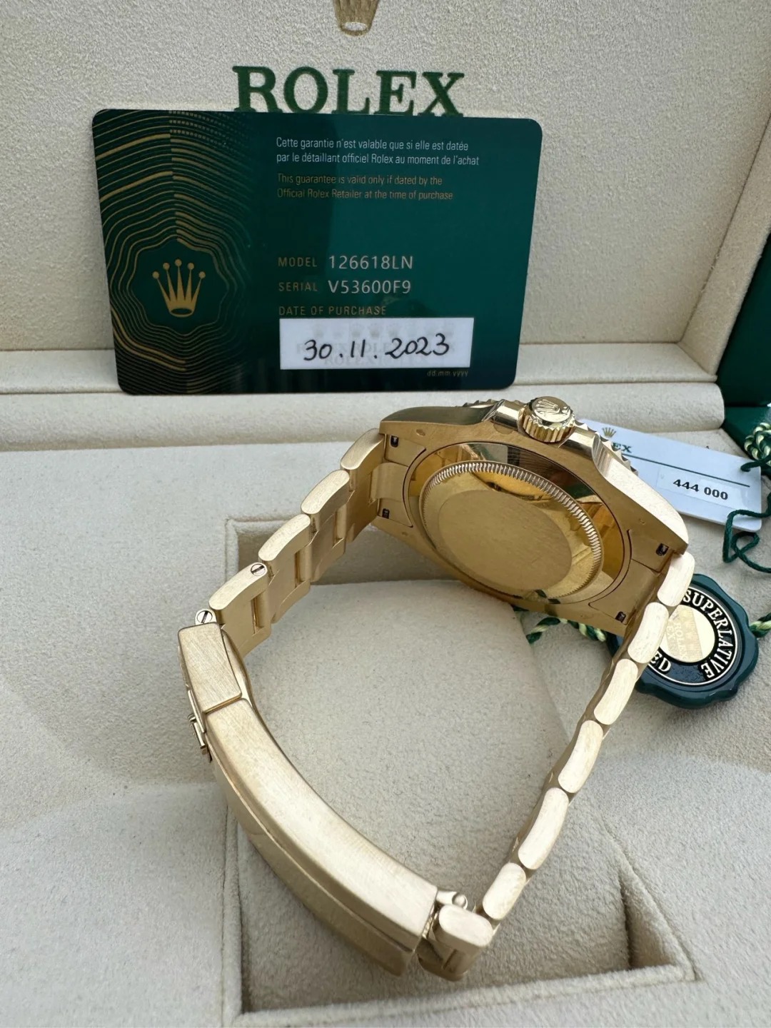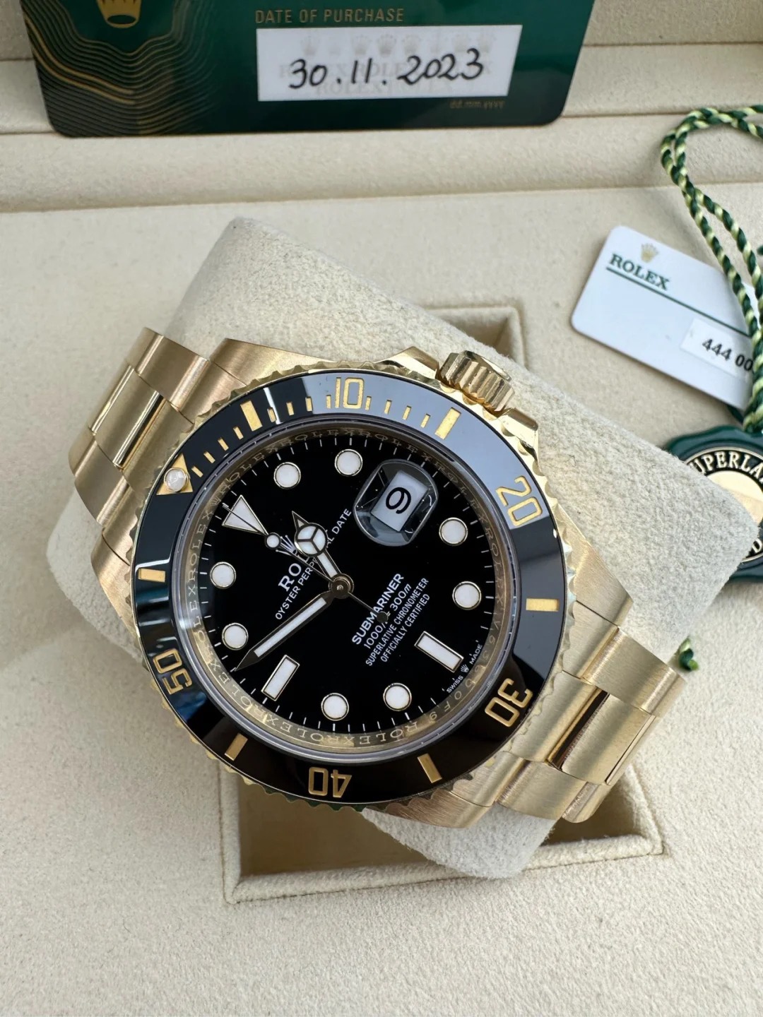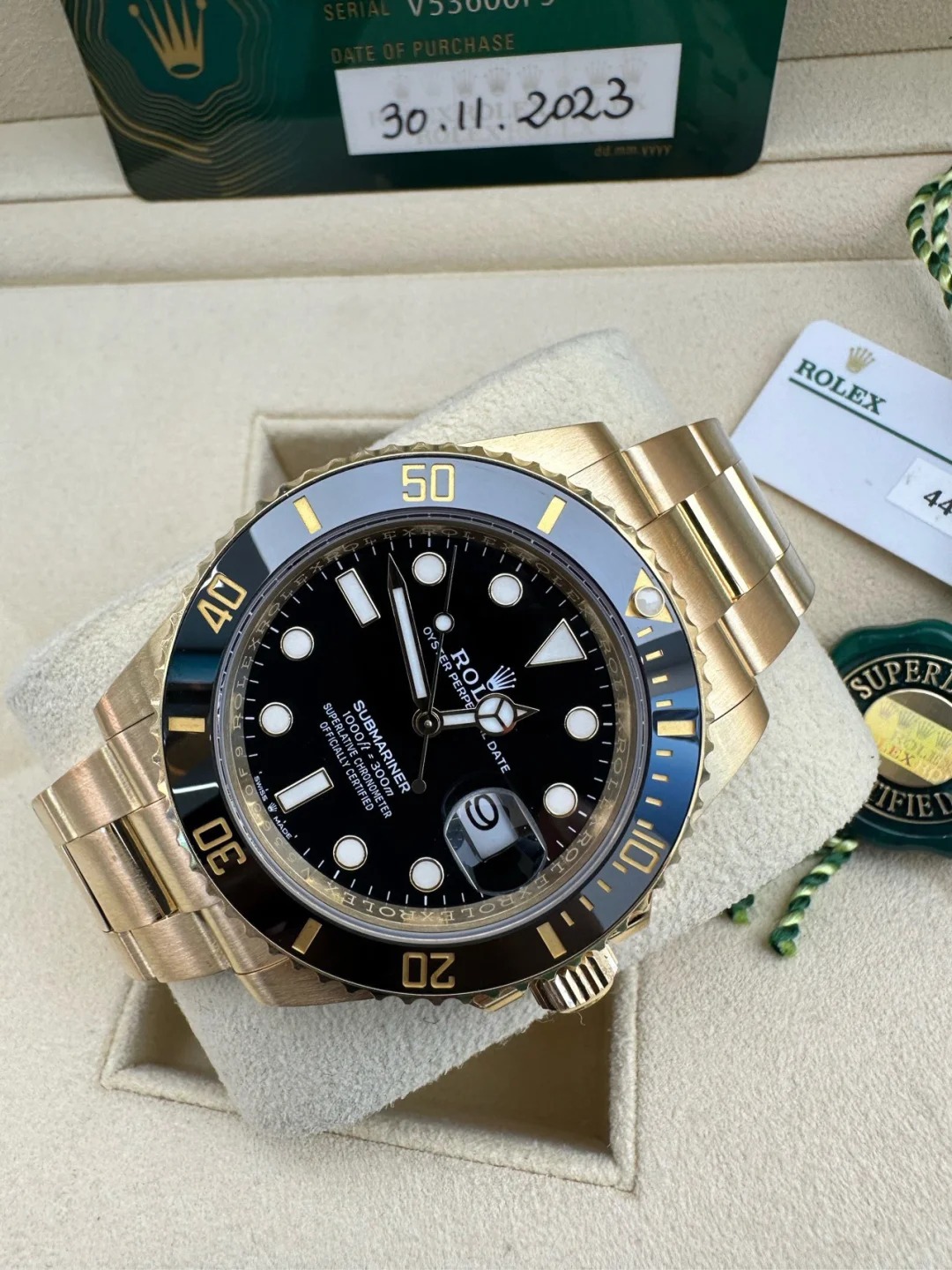 The Oyster Perpetual Submariner Date in 18 ct yellow gold with black Cerachrom insert in ceramic. black dial and oversized luminescent hour markers. -m126618ln-0002 41mm