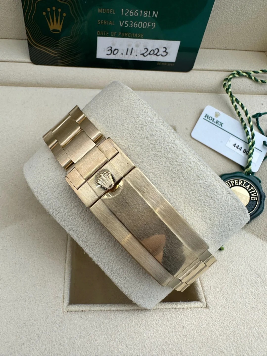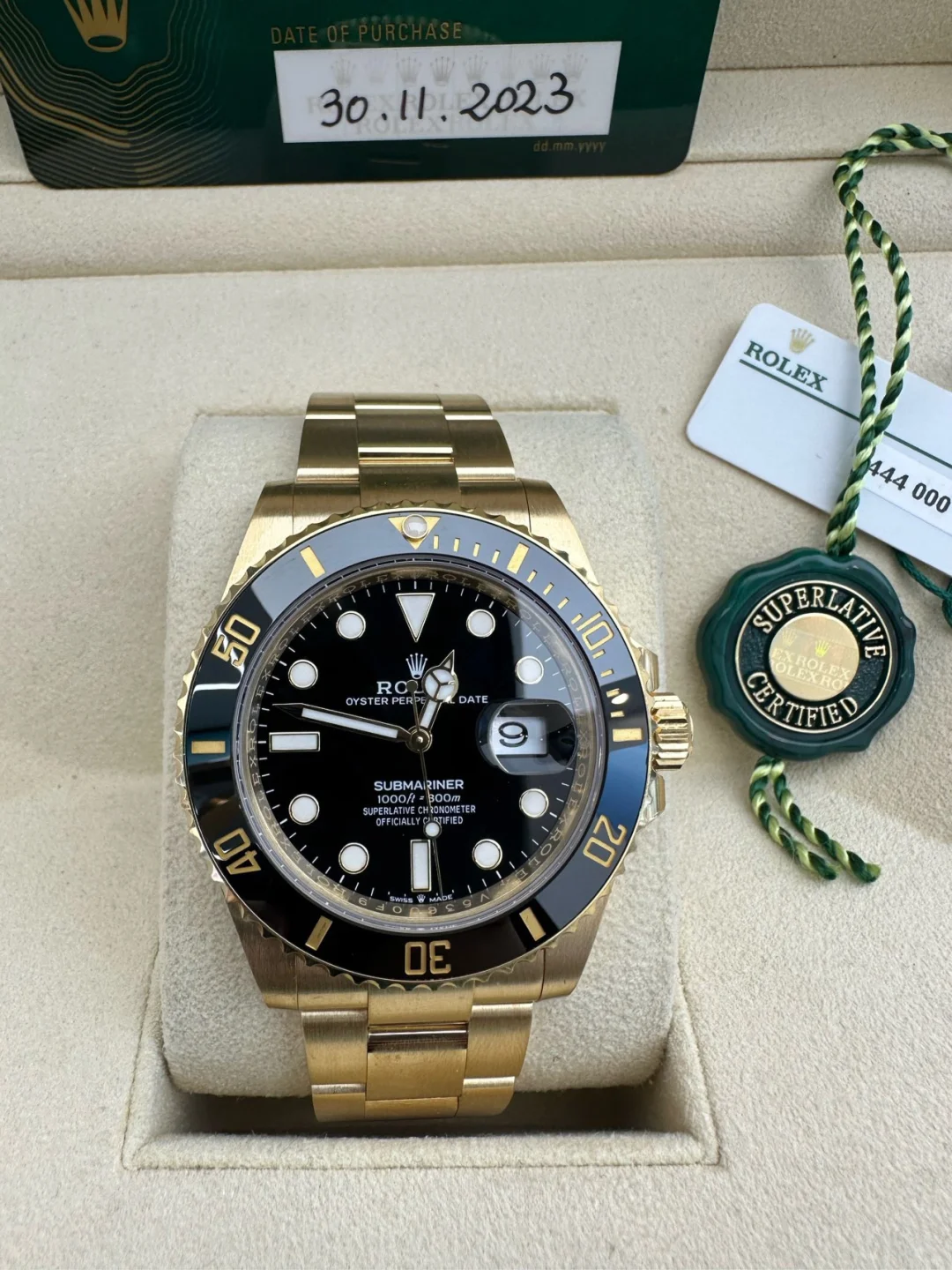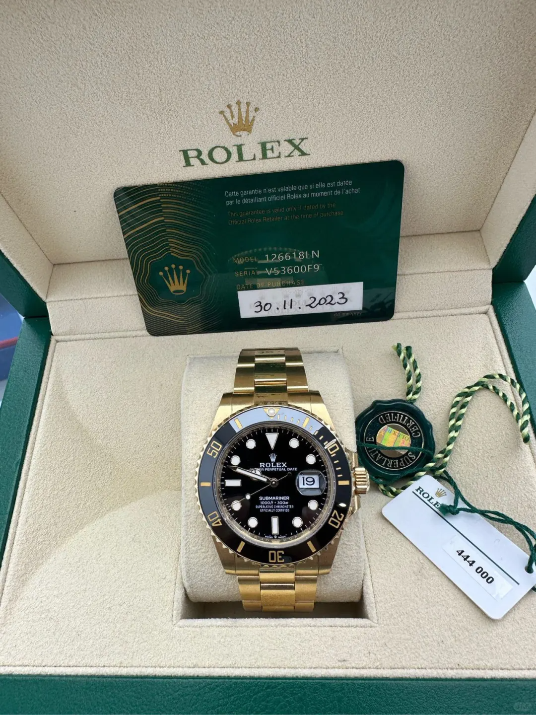 The Oyster Perpetual Submariner Date in 18 ct yellow gold with black Cerachrom insert in ceramic. black dial and oversized luminescent hour markers. -m126618ln-0002 41mm