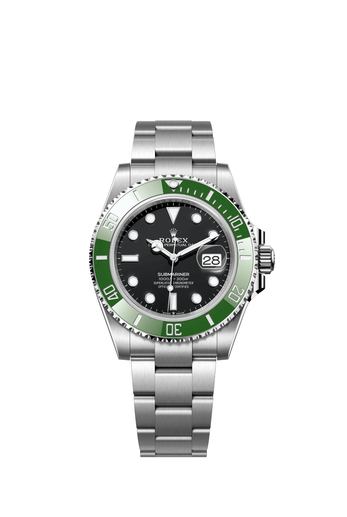 The Oyster Perpetual Submariner Date in Oyster steel with a green Cerachrom insert in ceramic. a black dial and oversized luminescent hour markers. -m126610lv-0002 41mm