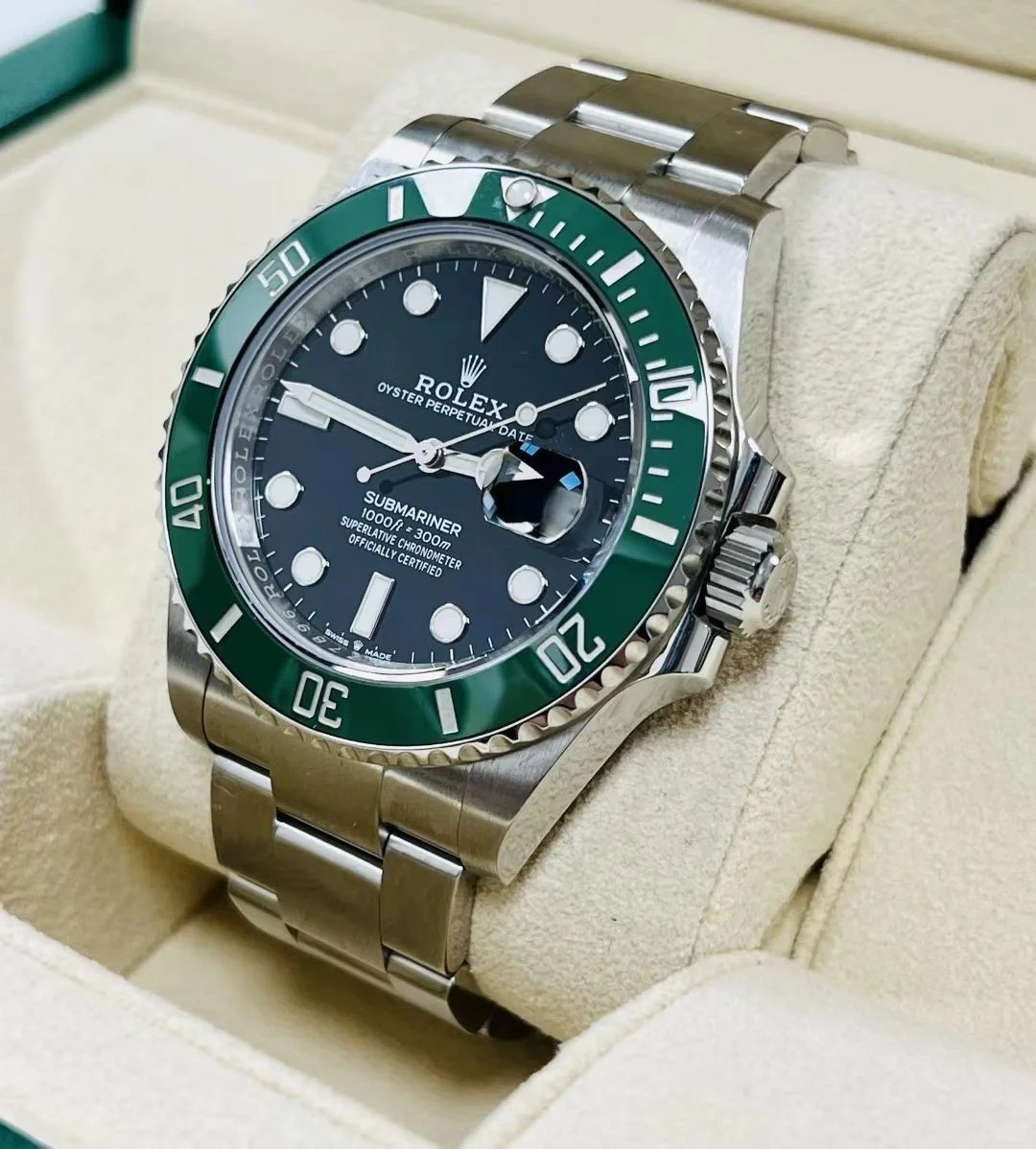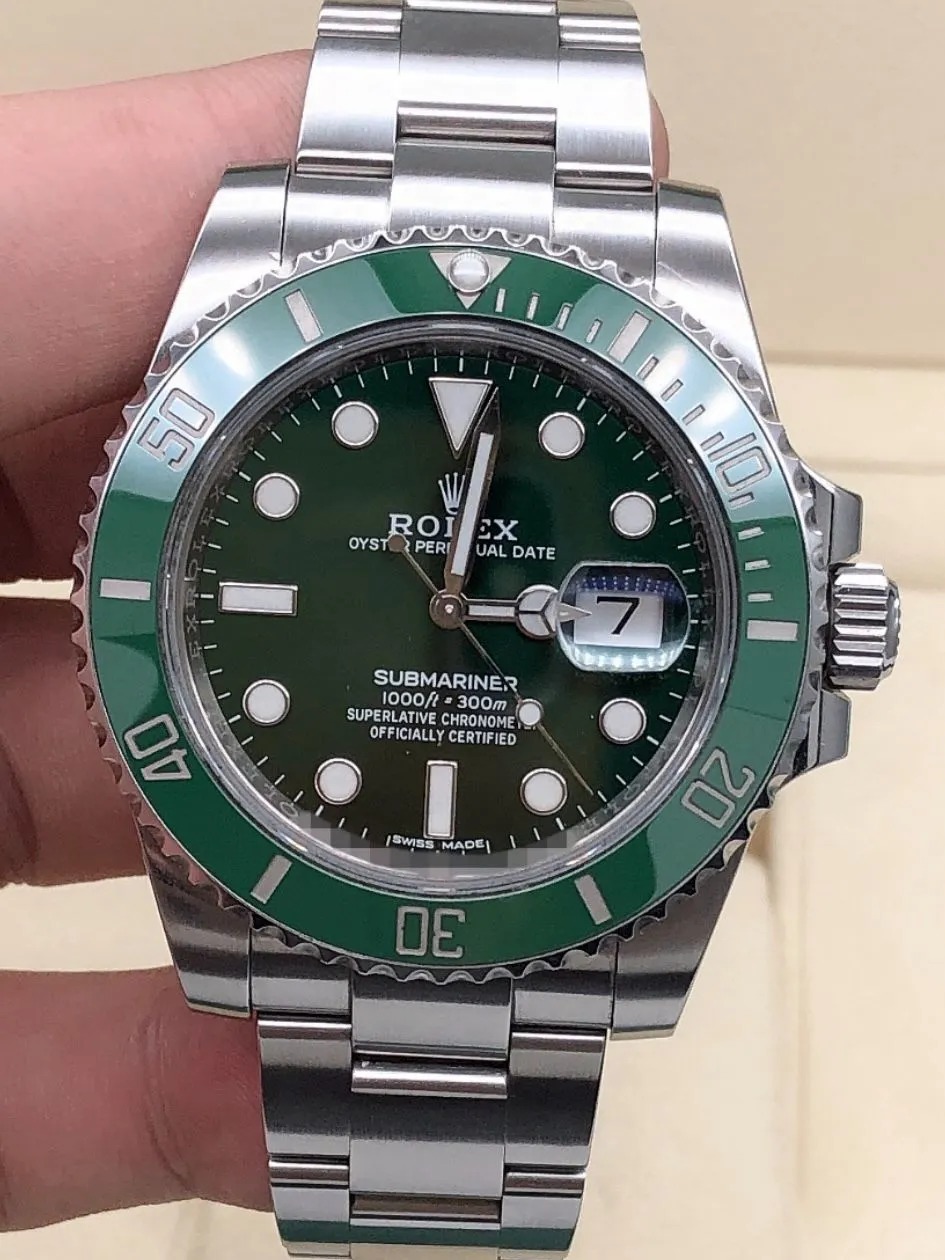 The Oyster Perpetual Submariner Date in Oyster steel with a green Cerachrom insert in ceramic. a black dial and oversized luminescent hour markers. -116610LV 41mm