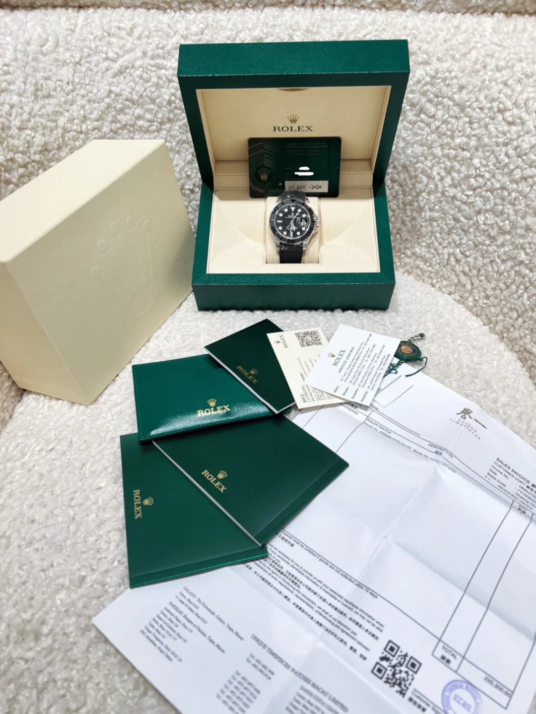 The watch is unworn and comes complete with full set of original accessories. such as watch box. warranty card dated recently. booklets and manuals.