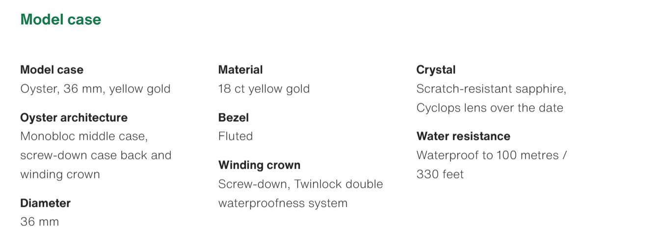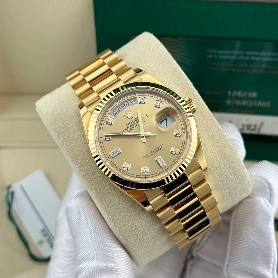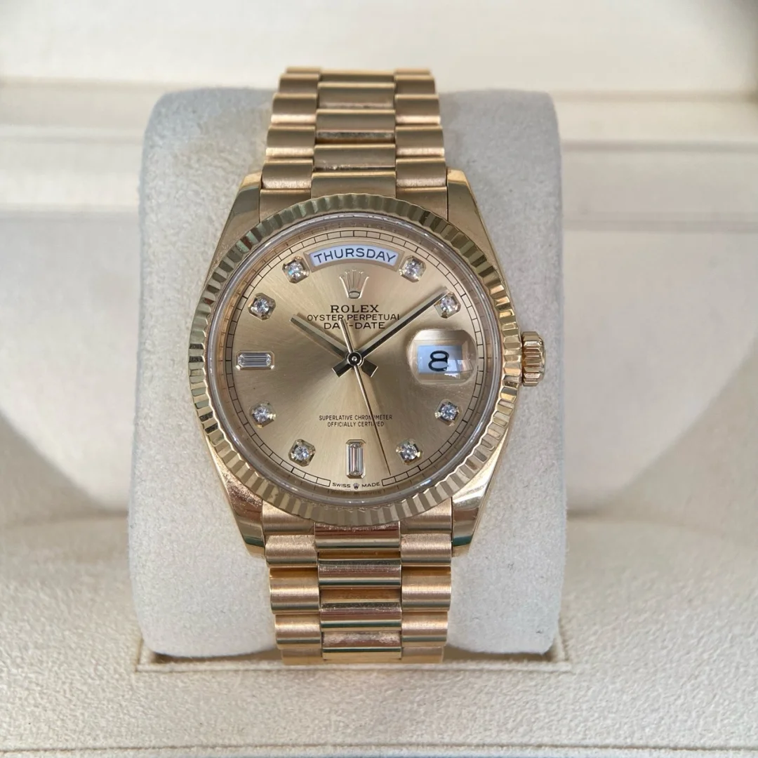 The Oyster Perpetual Day-Date 36 is available in 18 ct yellow gold with a champagne diamond-set dial. fluted bezel and President bracelet. -m128238-0132