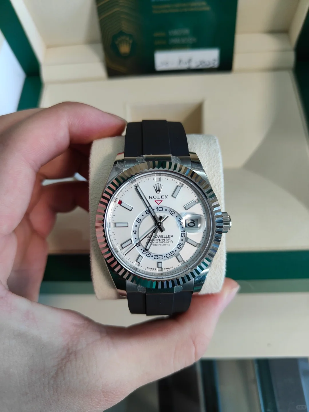 The watch is unworn and comes complete with full set of original accessories. such as watch box. warranty card dated recently. booklets and manuals.